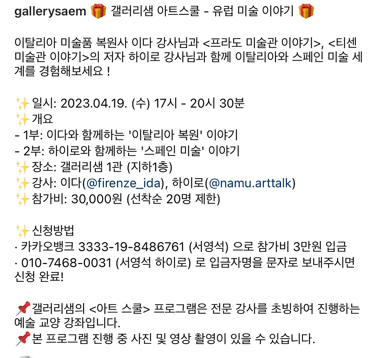 갤러리 샘이 진행하는 콜라보 강연