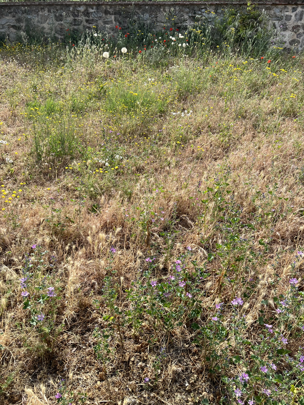 고대도시의 성벽 아래 돌담에 앉아