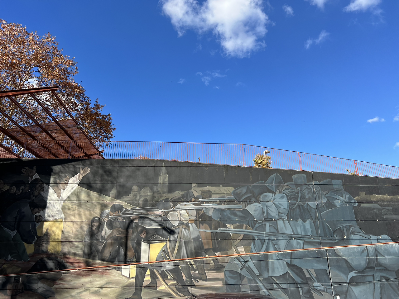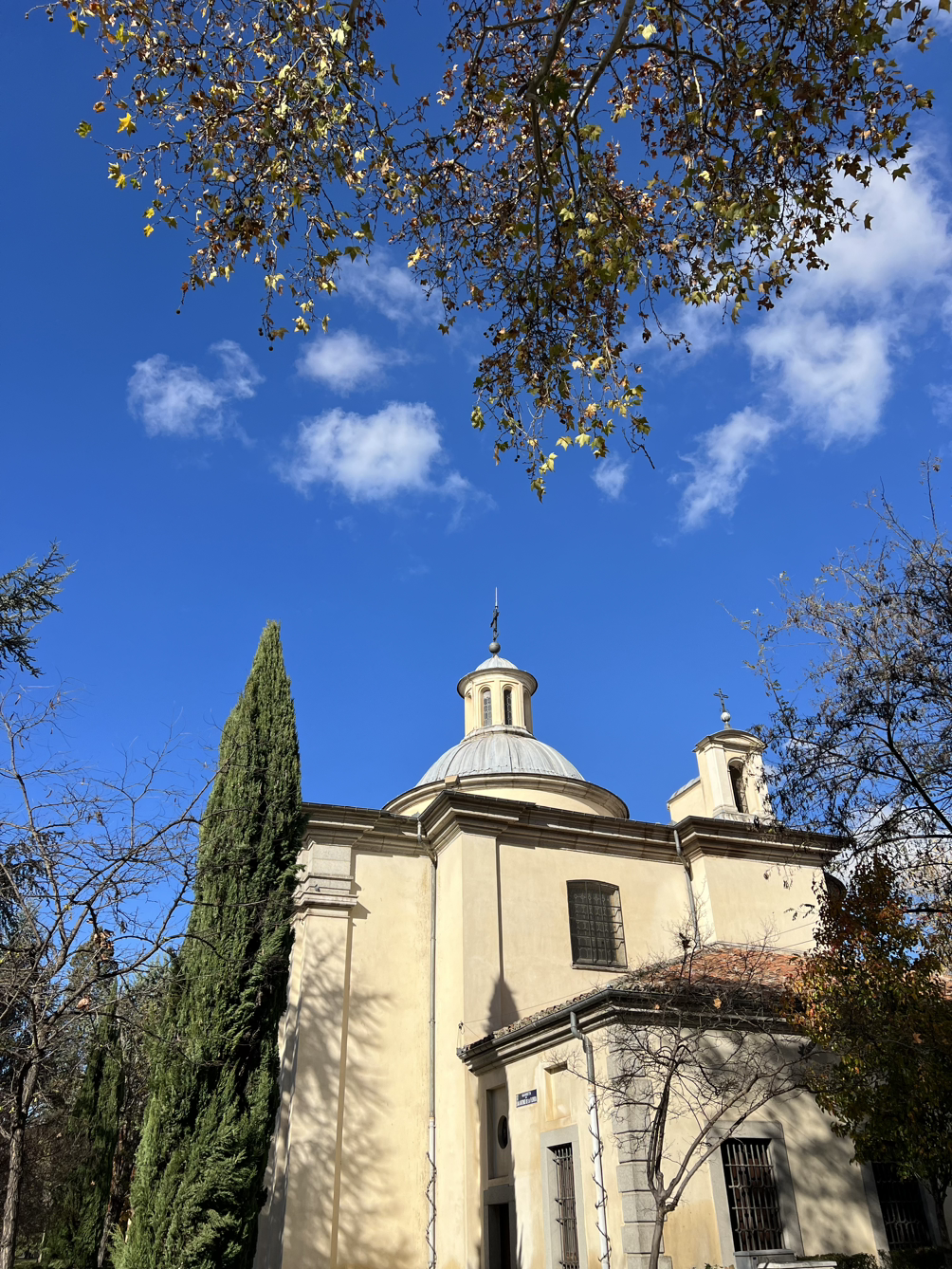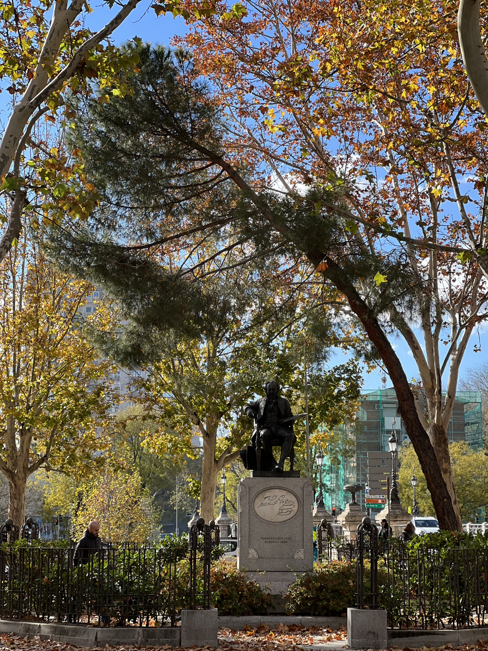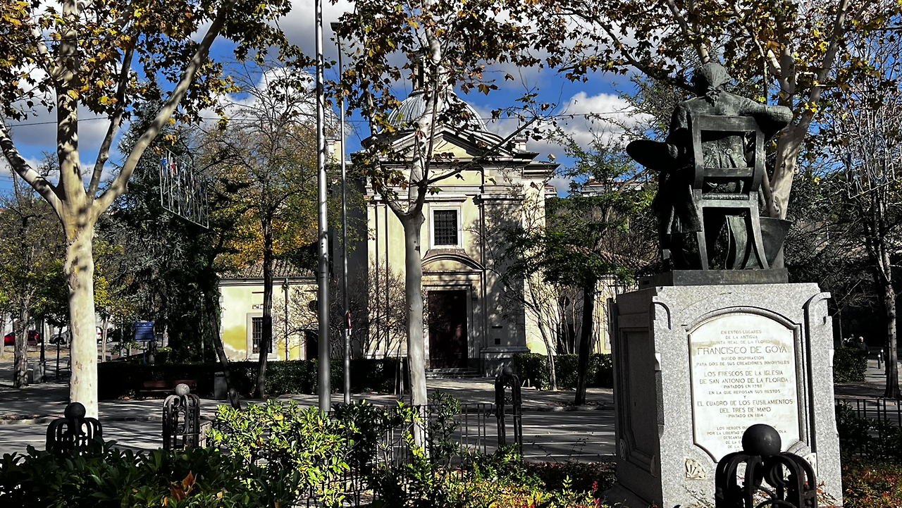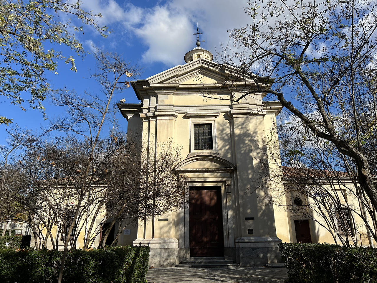 하지만, 프린시페 피오 역을 지나, 10분 정도 걸으니 1808년 5월 3일의 벽화를 만난드. 당시의 총성이 들리는 듯하디. 벽화의 건물이 아닌 그 다음 공원 중심에 인토니오 플로리다 성당이 작은 크기로 등장들 한다. 맞은 편에 고야가 앉아 있다. 티센에서 보던 그 중후함이 느껴지는 대목이다.