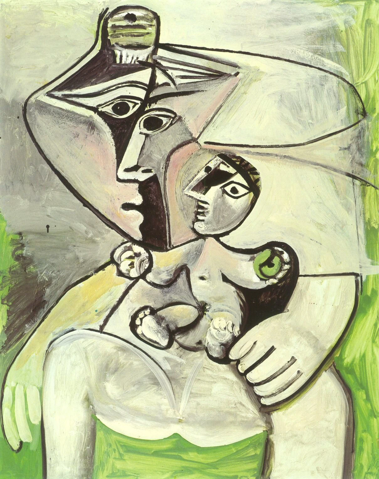무리요의 그림은 유럽 사람들의 마음에 위로가 무엇인지를 무염시태 성모의 온화한 미소와 함께 다양한 그림을 통해 그 포근하고 다정해 보이는 미소로 자신의 아픔의 현실을 버티고 이겨내도록 에너지가 되어 주었다. 이와 상반되게 피카소의 이 그림은 완곡한 표현법으로 성모와 아기 예수란 표현을 사용하기에는 뭔가 낯선 제스처가 우리 눈에 쉽게 안정감보다는 혼란을 주고 있다. 그러나 피카소는 바로 이 점을 우리에게 알리고 싶었을 것이다. 사물을 바라볼 때, 인간은 언제나 자신의 선입견과 편견에 기반한 지식의 울타리 안에서 사물을 보고 듣고 판단하고 받아들인다는 것을 말이다. 그러니 메이메의 소설에는 반응 안하던 이들이 비제가 음악으로 만들어 많은 이들에게 다가가려 하자 자신들의 가치관과 울타리를 벗어나 공유라는 합리성을 받아들이지 못해 악평하고 결국 숨지게 만들었던 내면의 치졸함을 피카소는 과감하게 꼬집은 것이다.
