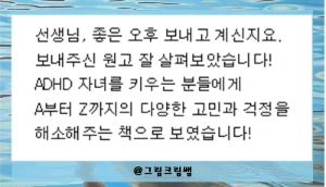 투고 당시 제 샘플원고와 목차를 본 다른 출판사에서는 "ADHD 자녀를 키우는 분들에게 A부터 Z까지의 다양한 고민과 걱정을 해소해 주는 책"이라는 평이 있었습니다.