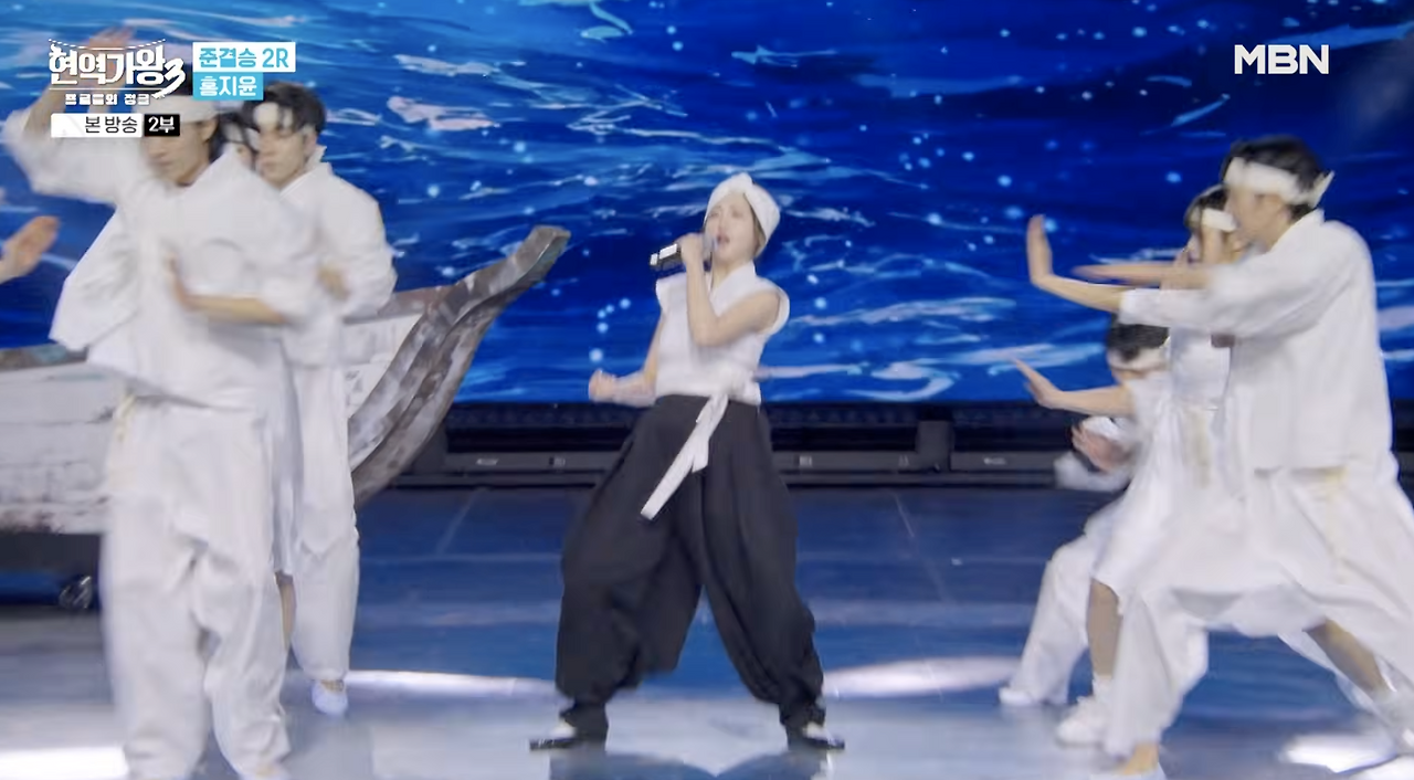 의상은 어부 콘셉트에 맞게 치마 대신 바지로 바꾸었는데 과거 전쟁터로 끌어내던 몸뻬 형태의 꽃무늬 홋바지를 검정바지와 반짝이 검정 고무신으로 대체하였고 흰 한복 댄서들과 구분되도록 본인만 상하의를 화이트 블랙톤으로 처리했다.