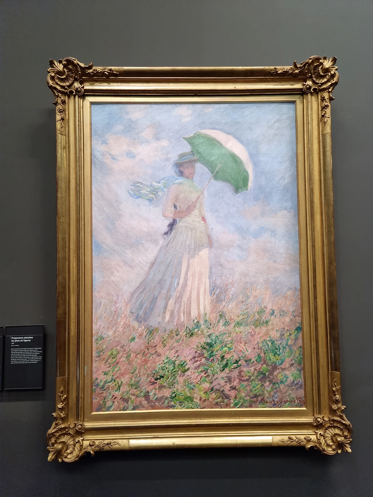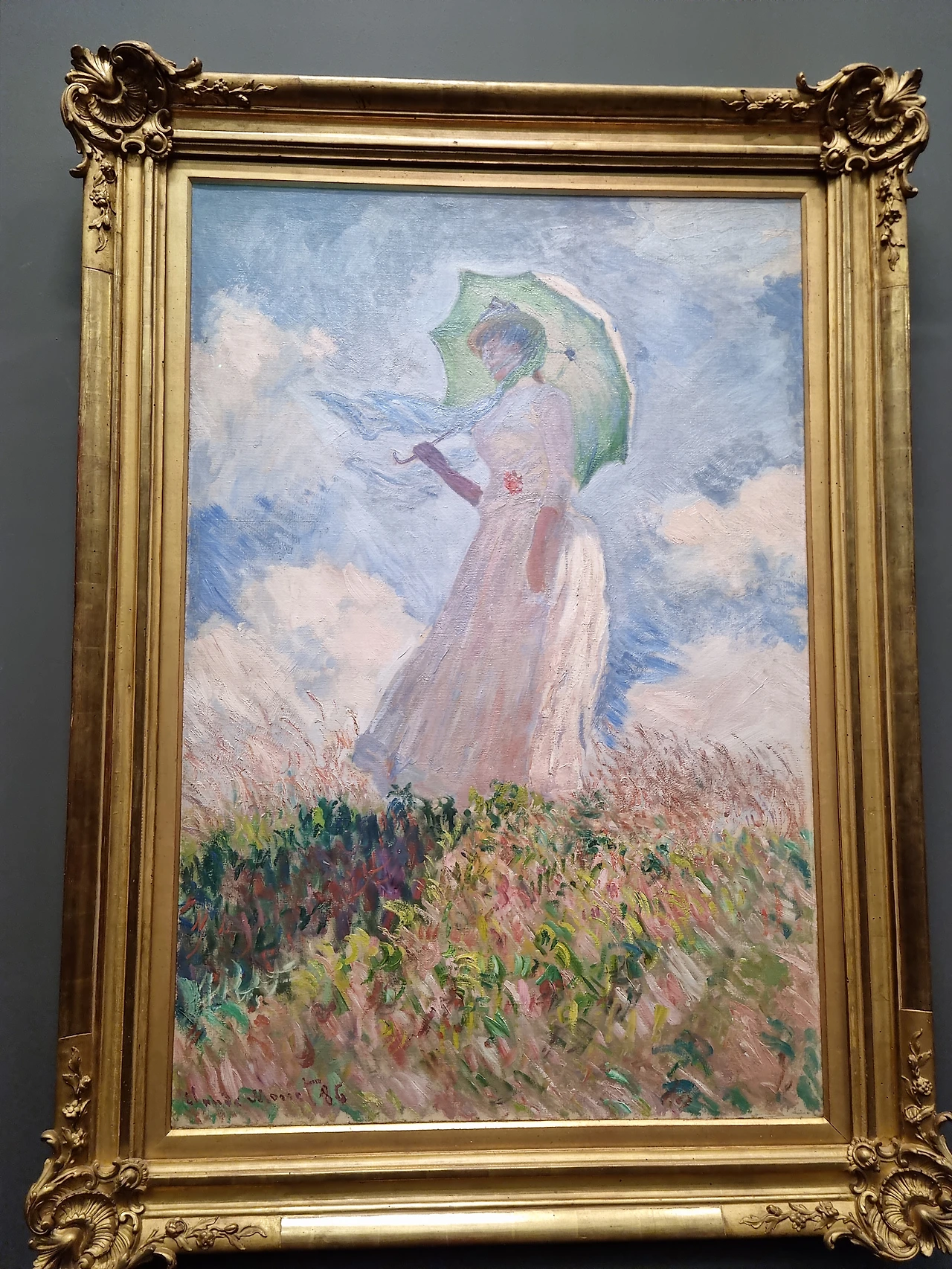 인물, 하늘과 들판의 붓질이 서로 다른데 비교적 화가에게서 가까이 있는 풀은 또렷하며 거칠게 멀리 있는 하늘과 여인은 흐릿하게 표현한 것이 아닐까 생각해 보았다. 바람의 역동성이 느껴지는 작품인 만큼 재생 버튼을 누르면 여인의 치마와 스카프가 흩날릴 것 같았다. 그림이 마음에 들어서 외국인분한테 그림과 함께 사진을 찍어줄 수 있겠냐고 요청하기도 했다. 그림과 나를 함께 찍어주셨는데 너무 마음에 들어 정말 감사하다고 말했던 기억이 난다.
