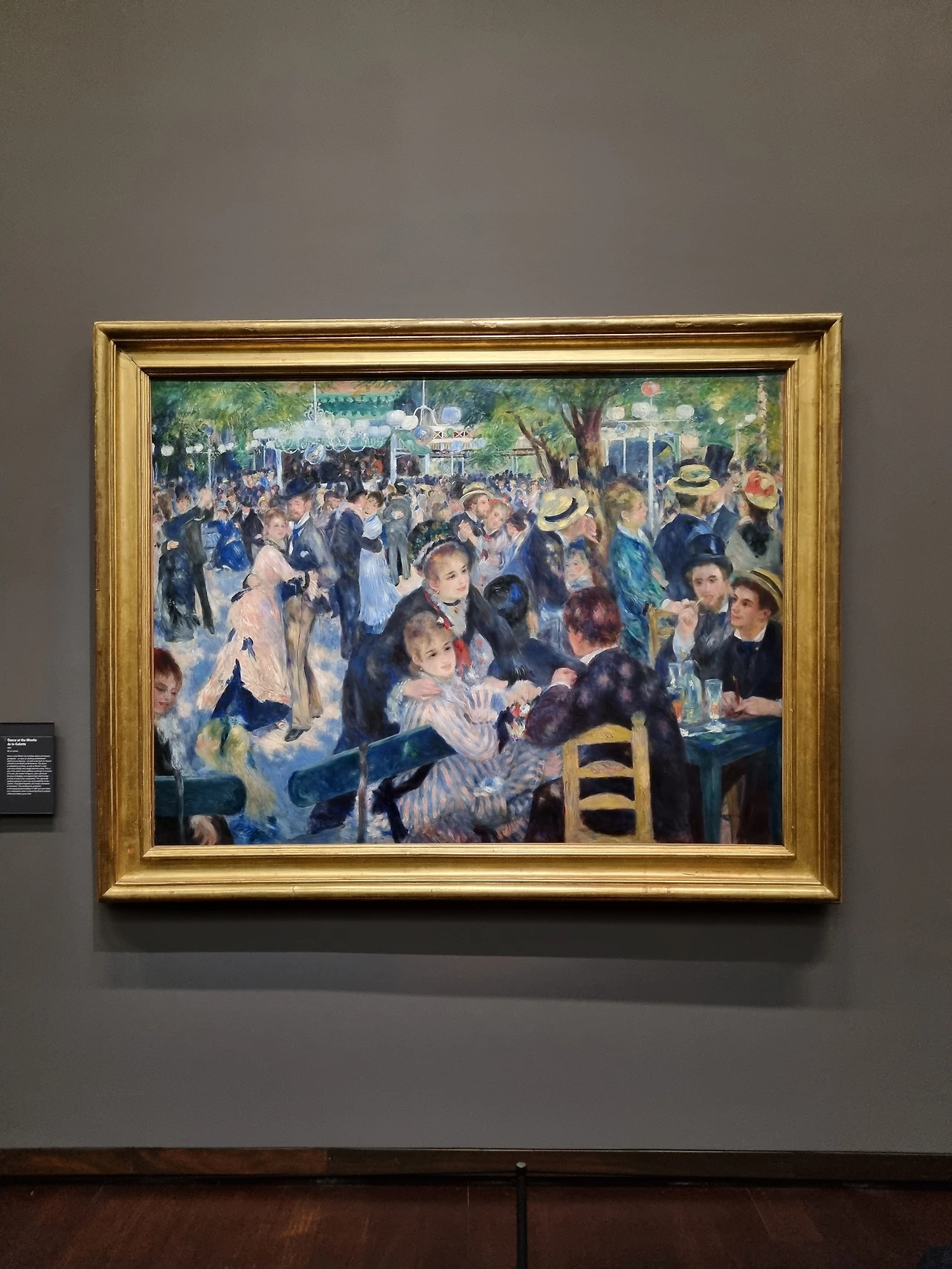 몽마르트르 언덕에 위치한 무도회장인 물랭 드 라 갈레트에서의 사람들의 모습을 그린 그림이라고 한다. 화창한 날씨, 행복한 사람들에 르누아르 특유의 붓질이 더해져 몽환적이면서도 따뜻한 주말 오후의 느낌을 받았다. 작품 옆에 쓰인 설명에 따르면 이 작품은 르누아르의 야심작 중 하나라고 한다. 큰 사이즈, 많은 피사체, 빛과 그림자의 표현 때문이다.