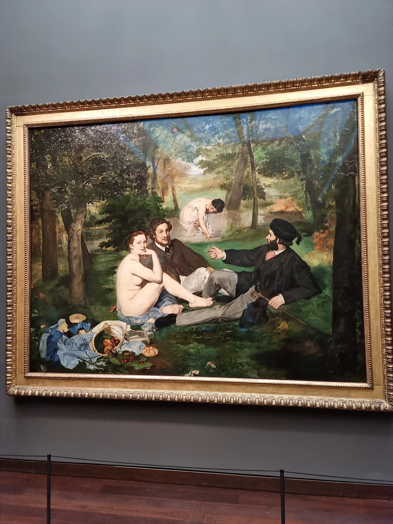 그림 옆에 있는 설명에 따르면 이 작품은 스캔들을 일으켰다고 한다. 1863년에 살롱에서 배제된 아티스트들의 작품을 전시를 열었는데 이 작품은 그동안의 전통적인 누드 장르와는 달랐기 때문이다. 고대의 신은 없고 모던한 복장을 입은 신사들에게 둘러싸인 누드의 여성만이 있기 때문이었다.