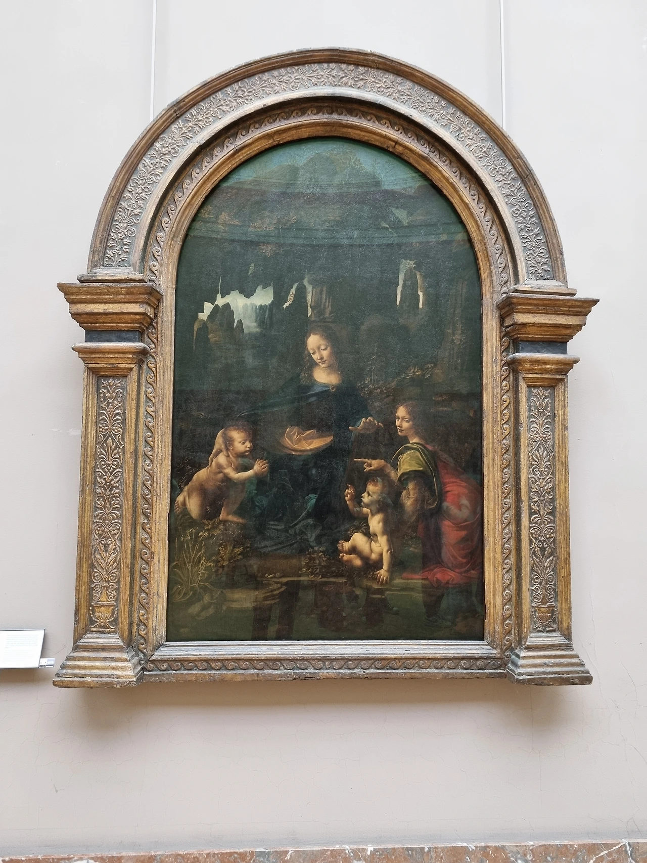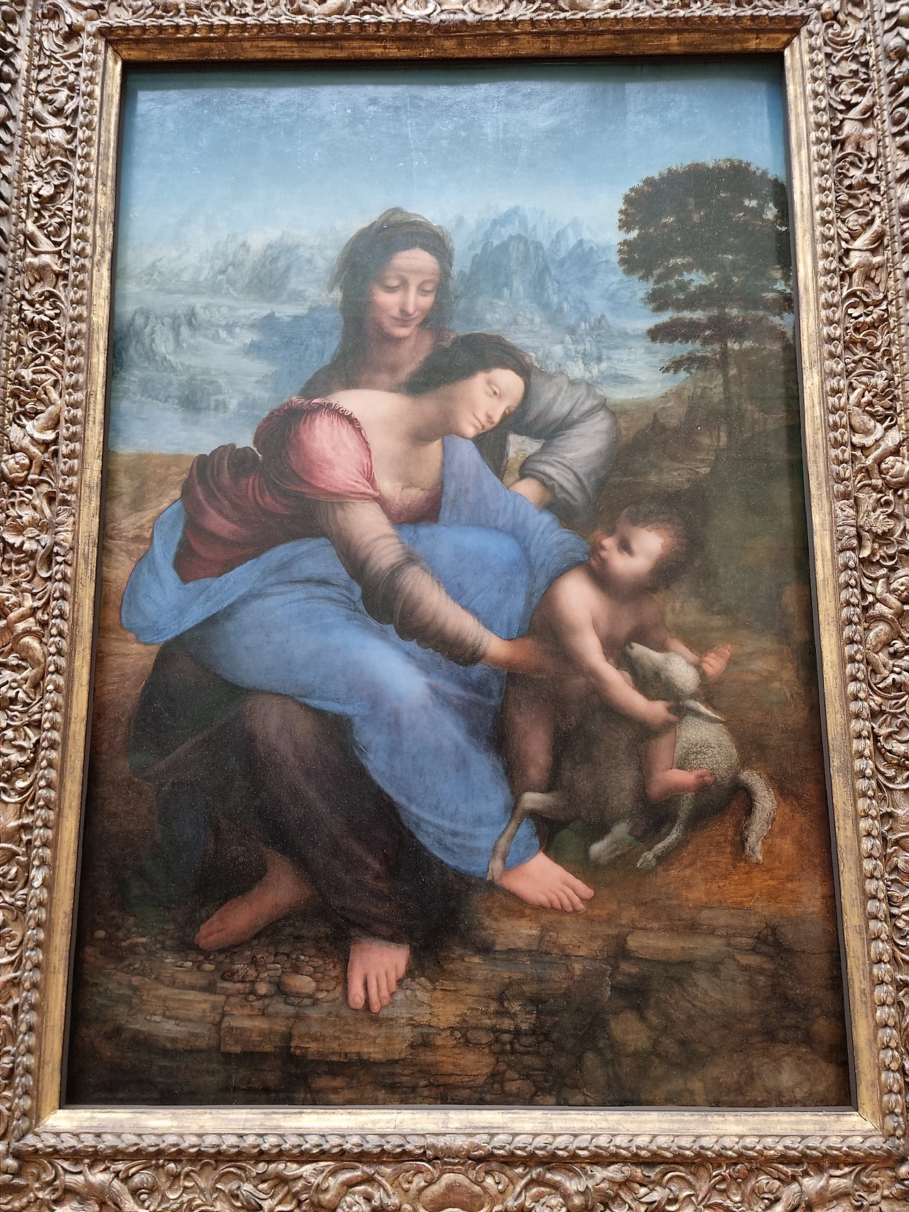 아기 예수와 세례 요한의 만남을 그린 장면이다. 왼쪽부터 인물을 살펴보면 세례 요한(십자가 지팡이 들고 있음), 성모, 아기 예수(세례 요한을 축복하는 손짓을 하고 있음), 천사 가브리엘(손가락으로 세례 요한을 가리키고 있음.)이 있다. 루브르 박물관에 가기 전 작품과 관련한 간단한 소개 영상을 보고 갔는데 영상에서 설명한 레오나르도 다 빈치의 스푸마토 기법을 볼 수 있었다. 스푸마토 기법은 윤곽선을 그리지 않고 경계를 희미하게 그리는 방식이다. 이러한 그림의 기법이 옛 일화의 그림을 몽환적이고 신비롭게 만드는 것 같았다.