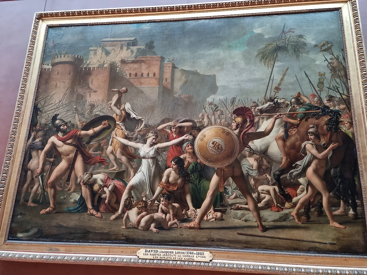 로마와 사비니 남자들 사이의 전쟁과 그를 중재하고자 하는 사비니 여인들의 그림이다. <호라티우스 형제들의 맹세>와는 사뭇 다른 구도가 보이는 작품이다. 아이를 내세우며 두 집단의 화해를 이끌고자 하는 다양한 여성의 모습이 인상적인 작품이다.