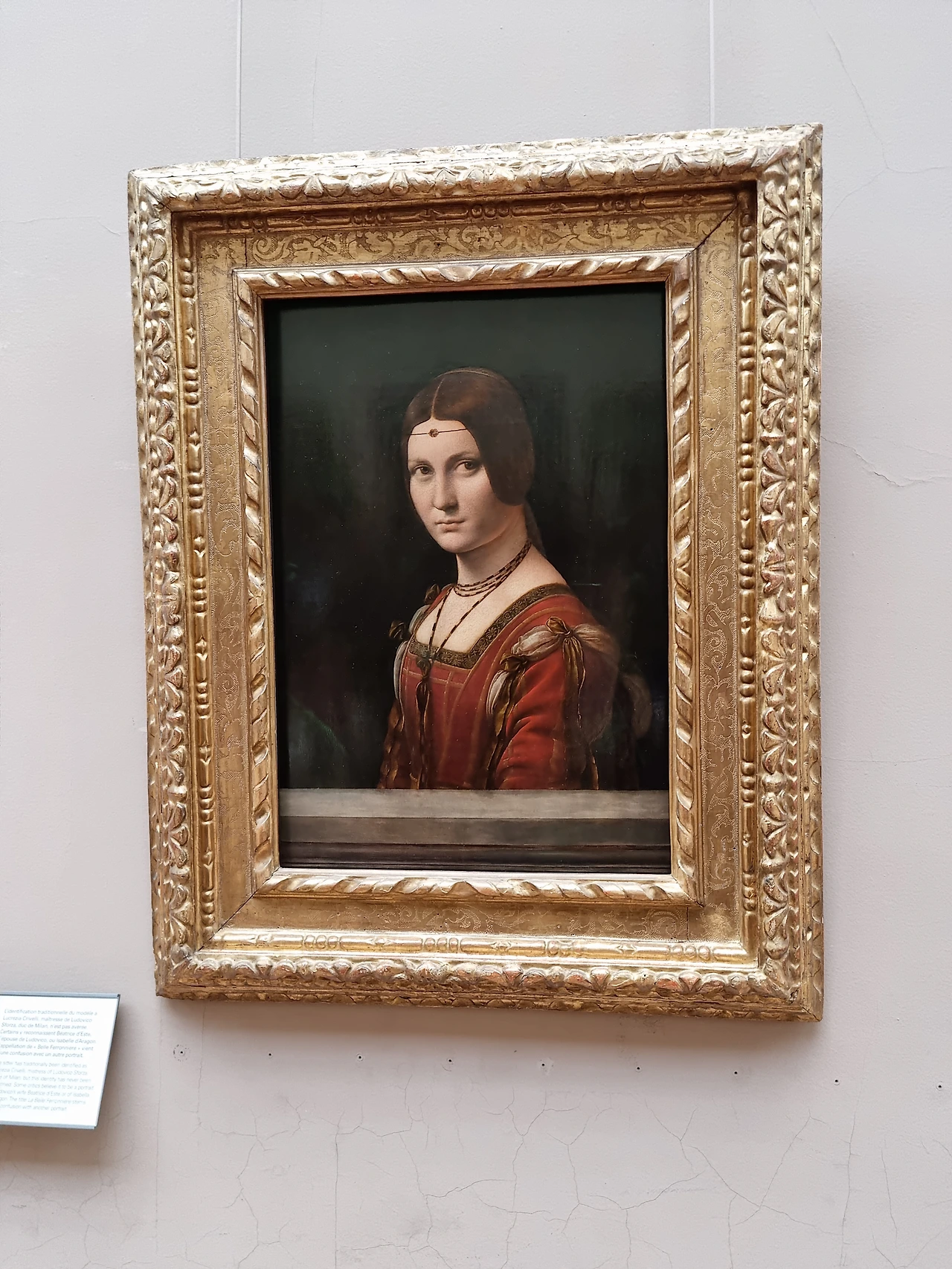 <모나리자>가 아닌 레오나르도 다 빈치가 그린 다른 초상화가 있어 유심히 감상하였다. 액자로 인해 처음에 인식하지 못했지만 그림의 하단에 창틀이 있다는 점이 신기했다. 검은 배경에 격식을 차리고 초상화를 그린 듯하면서도 지나가다 창문 너머로 누군가를 응시하는 듯한 자연스러움의 부조화가 인상적이었다.