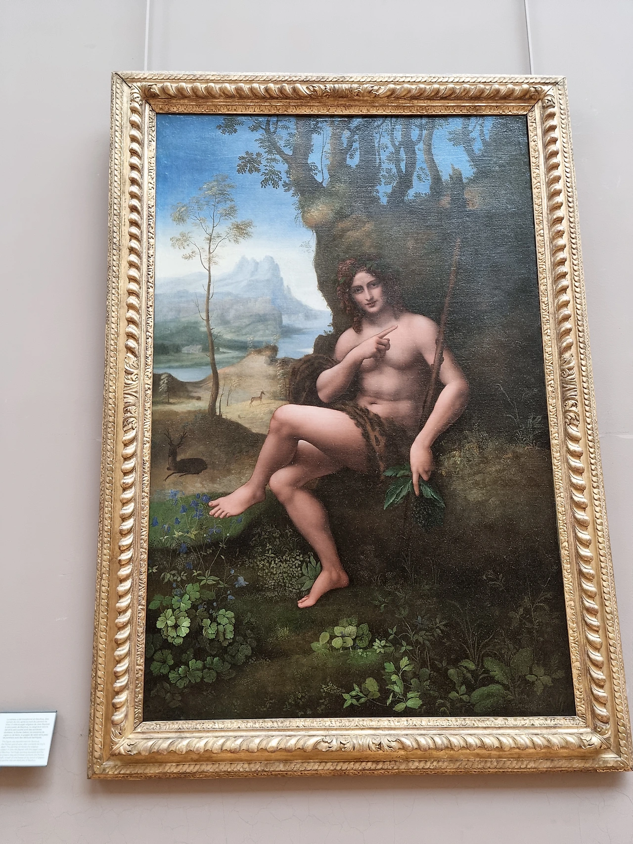 루브르 박물관에는 모나리자 이외에도 몇 점의 레오나르도 다 빈치의 작품이 있다. 모나리자는 사람이 너무 많아 잠깐만 감상이 가능하기에 그 이외의 작품을 좀 더 집중해서 보자는 마음으로 감상하였다. 이 그림은 털옷과 나무 막대기로 보아 세례 요한으로 보기도 하지만 손의 포도 넝쿨로 인해 바쿠스(술과 축제의 신)로 보기도 한다고 한다.
