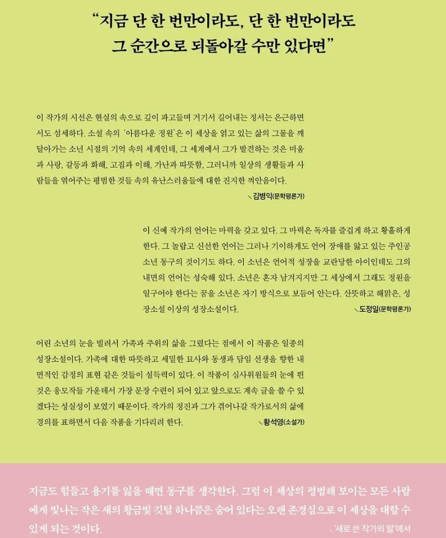 동구는 내게 유년 시절의 고통이자 순하고 단단한 강인함이다. 작가님이 말씀하셨듯 나도 "힘들고 용기를 잃을 때면 동구를 생각"할 것 같다. 어디선가 행복한 트럭 운전사로 전국 곳곳을 돌고 있을 동구를 마음 한 편의 따뜻한 방에 들이고 종종 함께하고 싶다. 그러다보면 나도 얼마쯤은 동구를 닮을 수 있겠지.