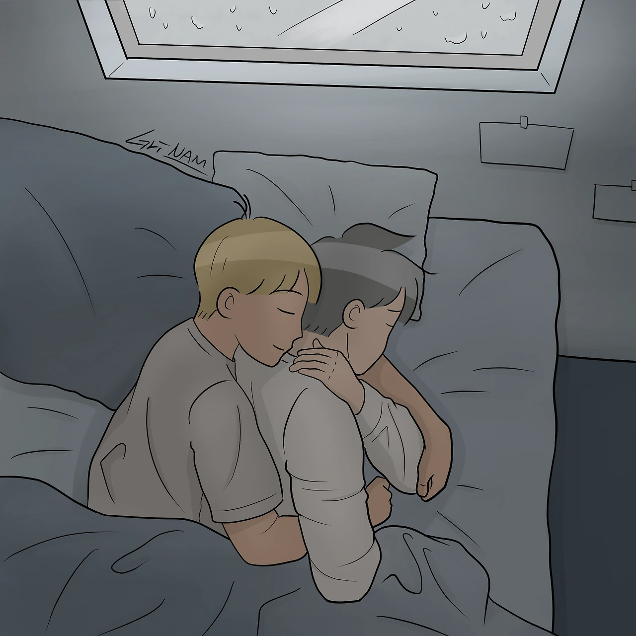 You and I, all day long, under the covers under the pretext of the sound of rain knocking on the windows and the cloudy sky.