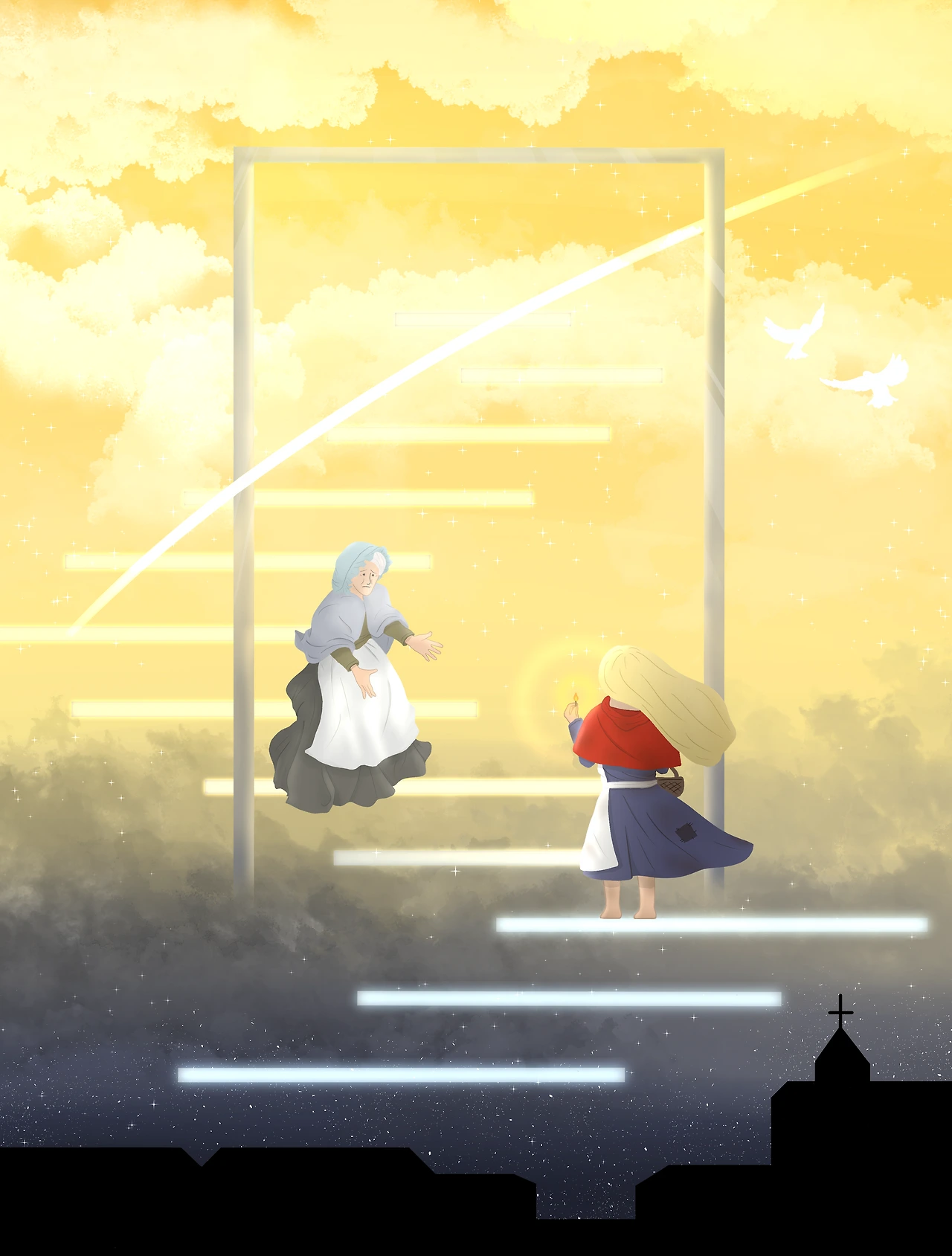 소녀의 말이 끝나자 희미해지던 할머니의 모습이 다시 뚜렷해지고 다 타버린 성냥개비들이 하늘에 떠올라 할머니한테 갈 수 있는 계단이 되었어요. 소녀는 계단에 발을 내딛고 한 걸음, 또 한걸음 계단을 오르면서 발아래 세상을 천천히 바라보았어요. 작은 소녀에게는 크고 차가운 세상이었지만 위에서 내려다본 세상은 소녀의 새끼손가락으로도 가려질 만큼 너무도 작은 세상이었어요.