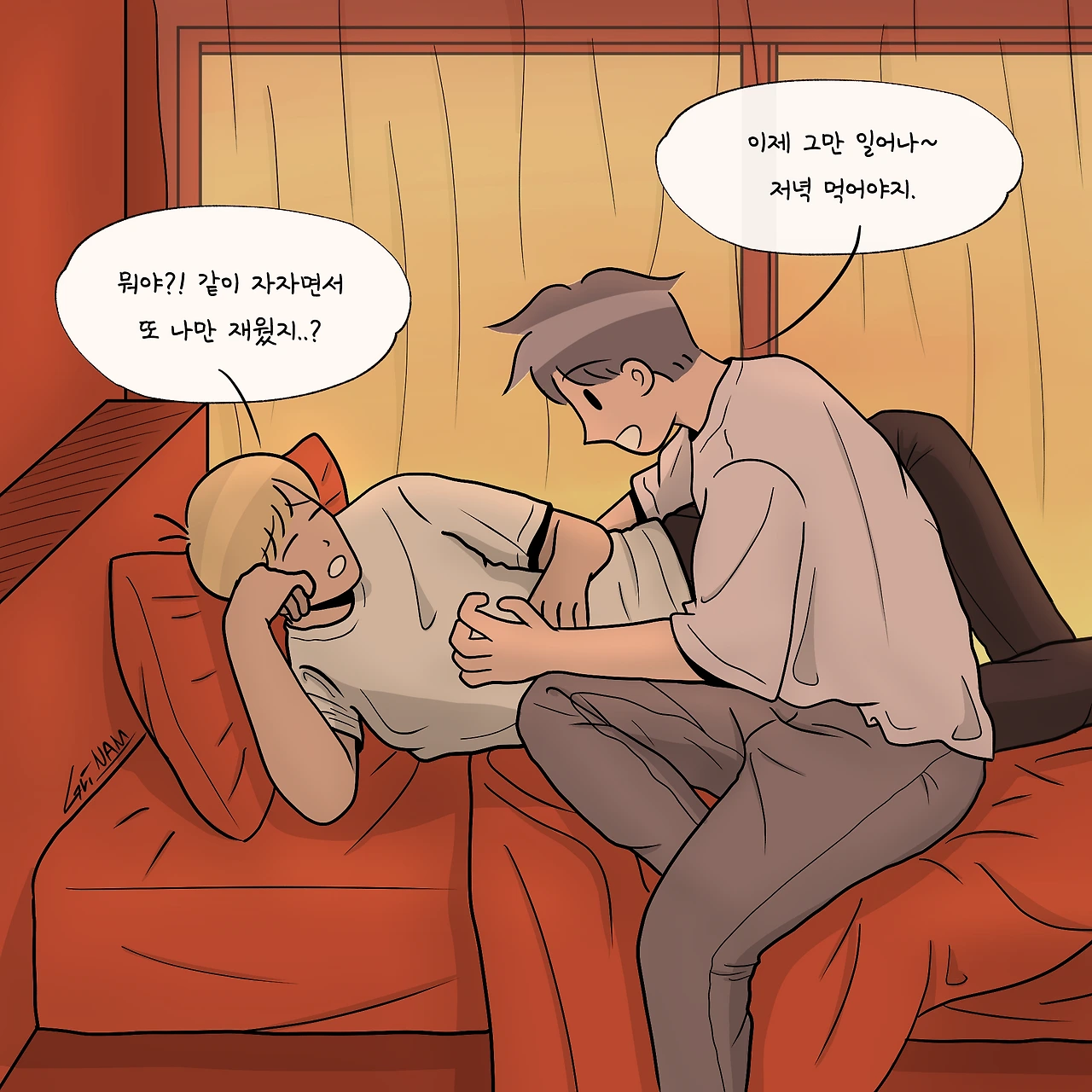 볕이 드는 침대 맡에 곤히 자고 있는