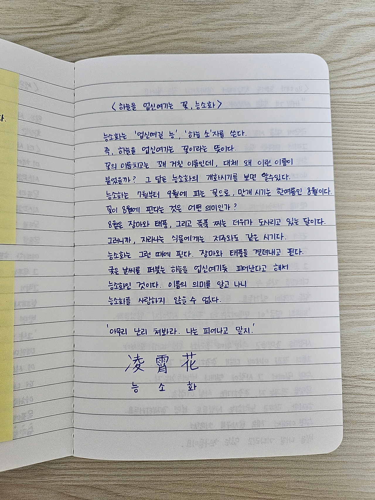 업신여길 능, 하늘 소자를 쓰며 하늘을 업신여기는 꽃이라는 의미를 지녔다. 식물에게는 저주와도 같은 장마와 태풍, 푹푹 찌는 더위 속에서도 당당히 꽃을 피워내는 능소화, 능소화를 떠올리며 오늘 아침 의지를 더욱 불태우고 힘을 얻을 수 있었다.