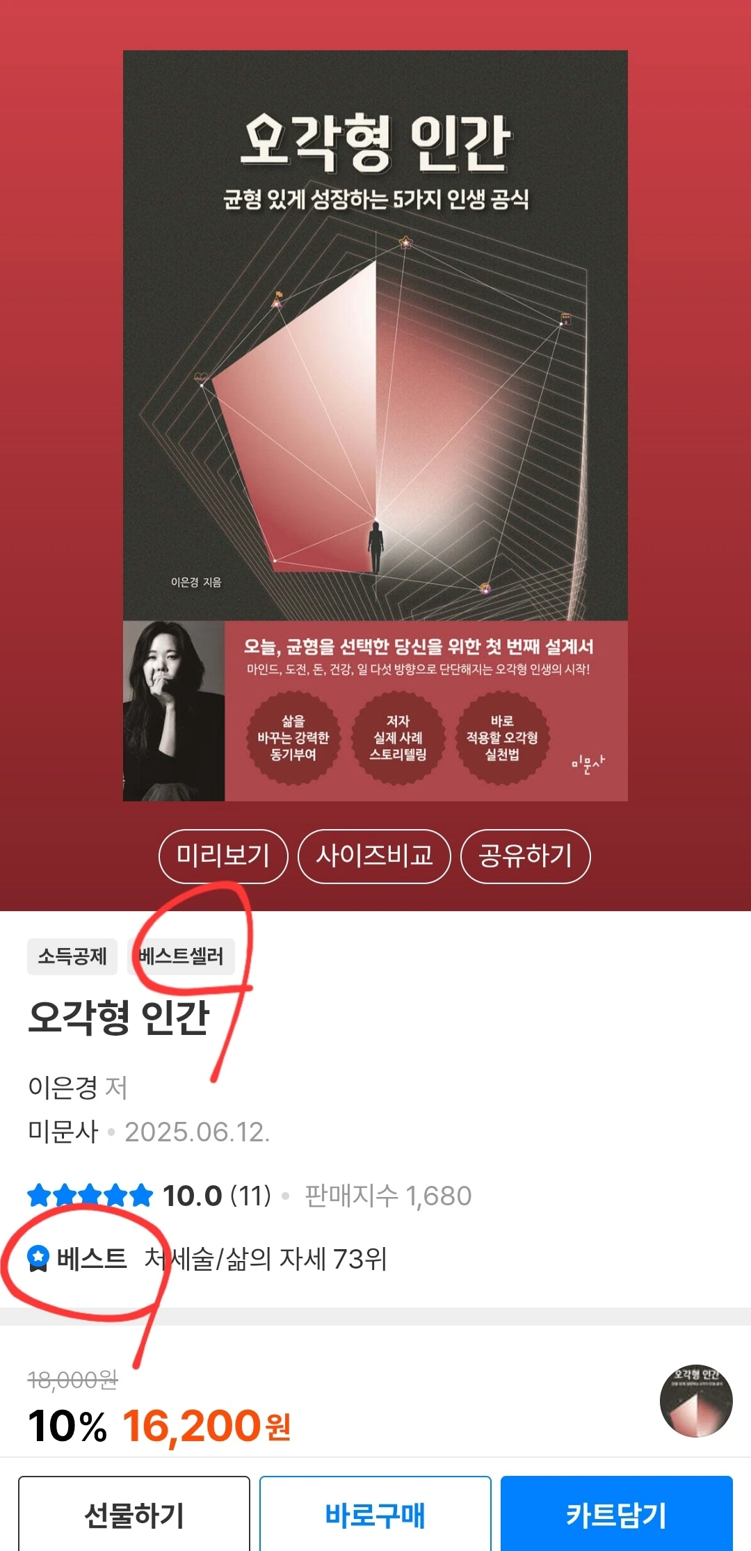 안녕하세요~^^오각형 인간 저자 이은경입니다. 5월 15일 저의 책, 오각형 인간 온라인 예약 판매가 시작되었습니다. 단 하루 만인 어제, 자기 계발(처세술/삶의 자세) 분야 베스트셀러에 진입했고 오늘은 그 순위가 더 올랐습니다. 순조로운 출발이네요.^^