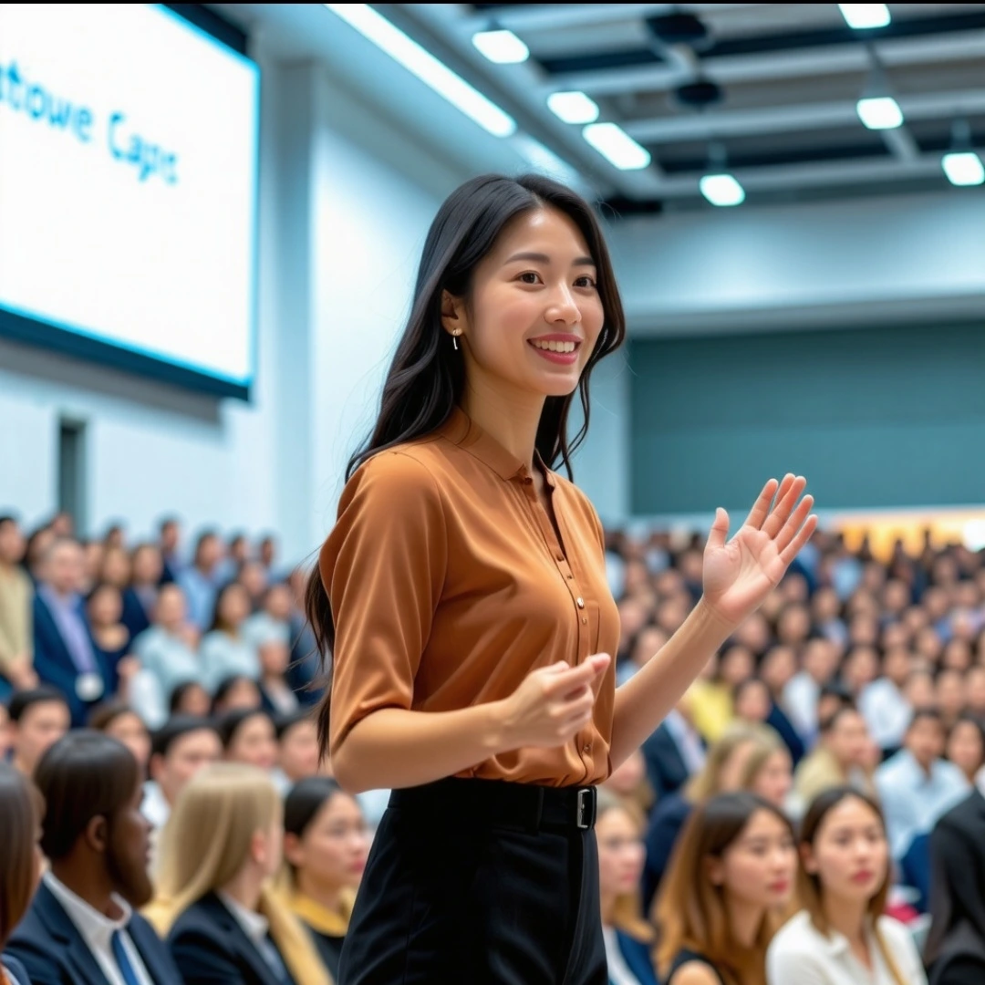 "좋아! 이제는 내가 이런 사람들 속에서 강연을 잘 해낼 수 있도록, 매일 새벽 이미지를 보며 긍정 확언과 시각화를 진행하려고 해. 나는 여성이야, 수많은 청중 속에서 자신감 넘치게 강연하는 모습을 그려줘."