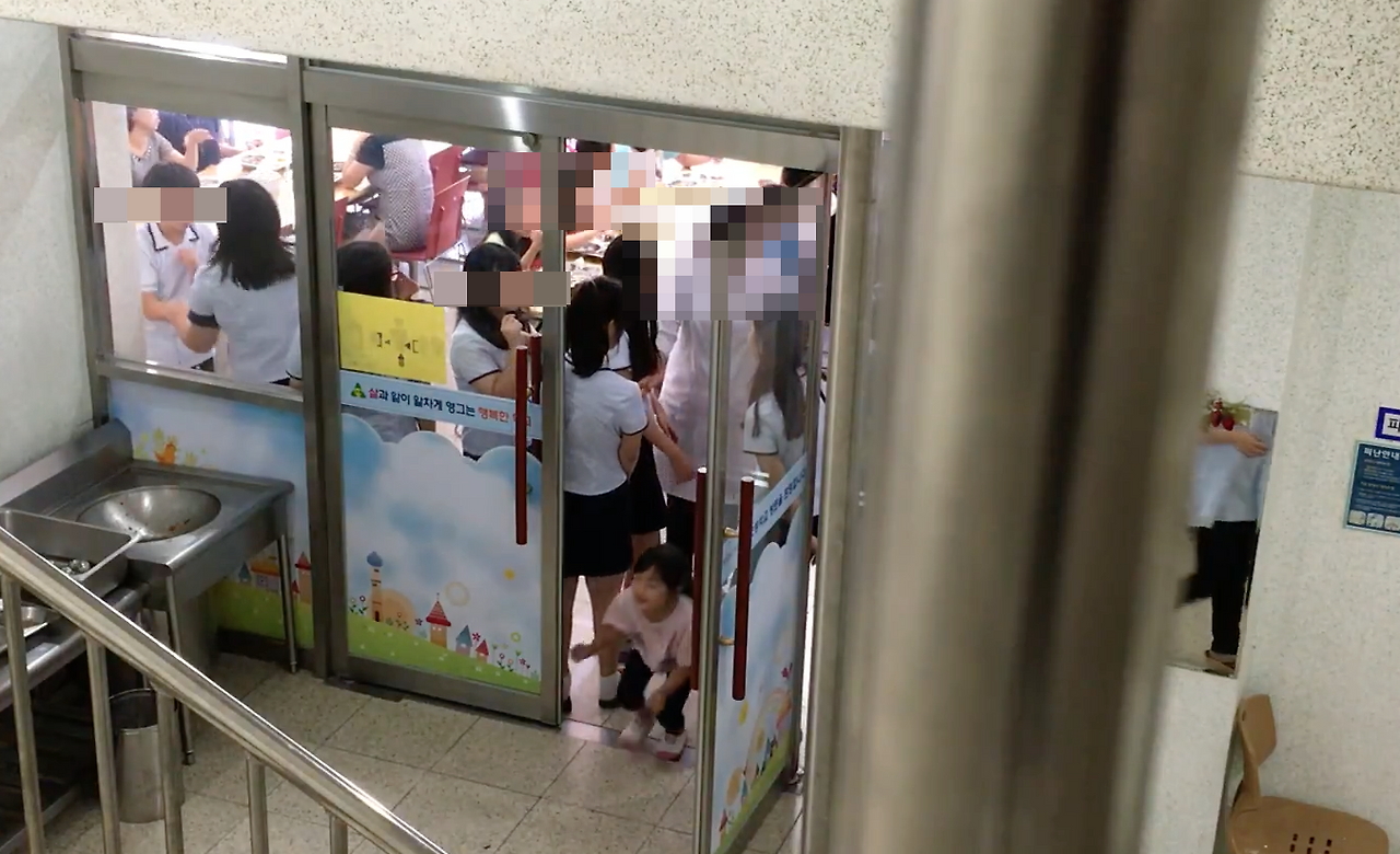 작은 학교인 우리 학교는 학생식당을 초등학교와 중학교가 함께 사용합니다. 초등학생들이 먼저 점심식사를 하면 10여분 정도 떨어져 있는 중학생들이 우리 학교로 와서 점심을 먹고 있습니다. 초등학생들이 점심을 거의 먹을 무렵 중학생들이 도착하기 때문에 식당에 앉을 자리가 부족하지는 않지만 문제는 밥을 먼저 먹은 초등학생들이 식당을 나가는 곳과 중학생들이 배식을 위해 줄을 서는 장소가 겹쳐 있어서 본의아니게 중학생들이 아이들의 길을 막게 되는 구조입니다.