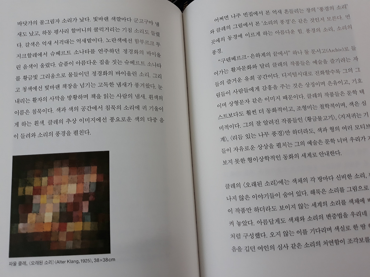햇빛과 바람 사이에서 반짝이며 소리를 내는 억새가 창을 스칠 때마다, 조각보 무늬처럼 다채로운 추억 간직한 유리창은 오래된 소리를 낸다. 사람과 사물의 마음에는 색색의 소리상자가 들어있다. 클레는 보일 듯, 보이지 않는 색색의 소리, 들릴 듯 들리지 않는 소리의 색색을「오래된 소리」란 그림에 새겨놓았다.