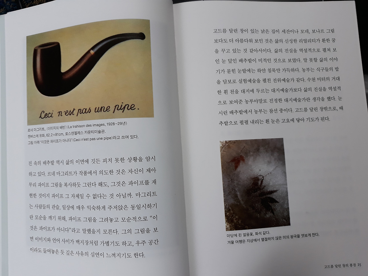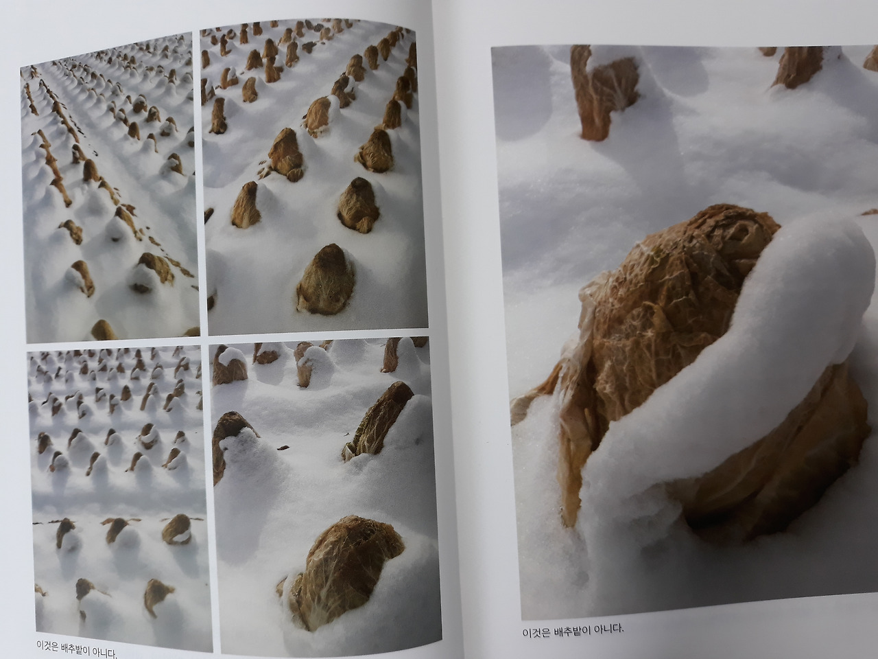 이것은 ‘파이프’가 아니라 ‘이것은 파이프가 아니다’라고 말하고 있는 문장이다. 배추밭에서 얼은 채로 눈을 뒤집어쓴 ‘배추’ 역시 그것은 ‘배추’가 아니라 그것은 ‘배추’라고 말하고 있는 문장이다. 배추밭 역시 그것은 배추밭이 아니다. 사진 속의 배추밭은 우리에게 박제되어버린 이미지, 혹은 이미지의 배반이 있을 뿐이다. / P22~24 발췌