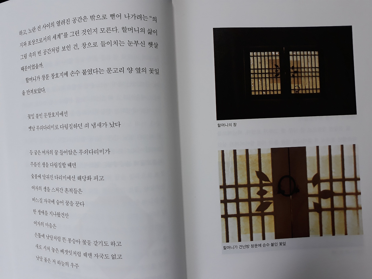아름다운 ‘당혹’이랄까! 그러나 수수께끼 같은 ‘아포리’는 지극히 철학적이고 미를 판단하는 형이상학이다. 기실 시골집 창의 이미지를 판단하는 미의 기준은 연민에서 나온다. 그냥 지나칠 수도 있는 길가 하찮은 풍경에 눈길 줄 수 있는 연민. 세상에 존재하는 사물과 풍경 속에서 정겨움과 쓸쓸함을 느낄 수 있는 연민. 따뜻한 허무가 무장무장 쌓이는 창의 연민……