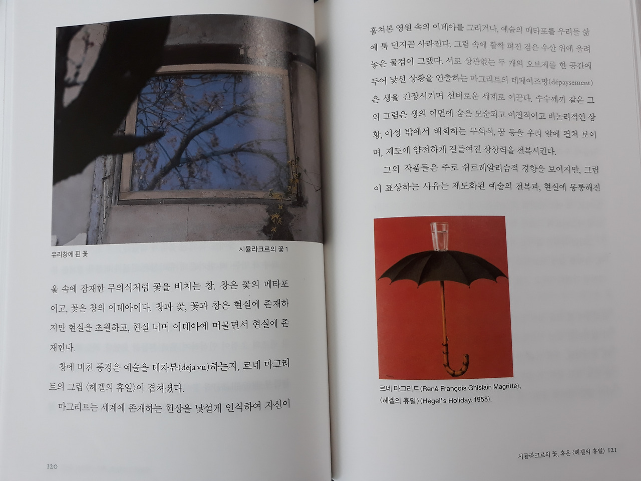 꽃들은 보석처럼 빛났다. 그리고 비가 오면 창에도 복제된 꽃비가 내렸다. 목수가 만든 벽 한가운데 유리창은 현실과 픽션의 경계를 무너뜨리는 가상공간이다. 사계의 풍경을 색다르게 담아내는 유리창은 폐쇄 회로 속의 테크놀로지 아트처럼 유희적인 그림을 만든다. 유리창에 드리운 나뭇가지와 줄기마다 핀 꽃들은 카메라 렌즈의 초점이 인식하지 못해 흔들려 보였다. 의도하지 않은 작란作亂 같은 이 의도는 사물의 아우라가 사라진 허상, 즉 시뮬라크르simulacre의 꽃이다. 거울의 표면에 비친 얼굴처럼, 심층일랑 헤아리기 어려운 거울 속에 잠재한 무의식처럼, 꽃을 비치는 창. 창은 꽃의 메타포이고, 꽃은 창의 이데아이다. 창과 꽃, 꽃과 창은 현실에 존재하지만 현실을 초월하고, 현실 너머 이데아에 머물면서 현실에 존재한다. 창에 비친 풍경은 예술을 데자뷰deja vu 하는지, 르네 마그리트René François Ghislain Magritte의 그림 「헤겔의 휴일Hegel's Holiday」이 겹쳐졌다. 마그리트는 세계에 존재하는 현상을 낯설게 인식하여 자신이 훔쳐본 영원 속의 이데아를 그리거나, 예술의 메타포를 우리들 삶에 툭 던지곤 사라진다. 그림 속에 활짝 펴진 검은 우산 위에 올려놓은 물 컵이 그랬다. 서로 상관없는 두 개의 오브제를 한 공간에 두어, 낯선 상황을 연출하는 르네 마그리트의 데페이즈망dépaysement은, 생을 긴장시키며 신비로운 세계로 이끈다. 수수께끼 같은 그의 그림은 생의 이면에 숨은 모순되고 이질적이고 비논리적인 상황, 이성 밖에서 배회하는 무의식, 꿈 등을 우리 앞에 펼쳐 보이며, 제도에 얌전하게 길들여진 상상력을 전복시킨다. 일상에 길들여진 생을 낯설게 보여주는 전복이란 얼마나 멋진가. 마그리트 말대로 그가 물 컵을 천재적으로 표현하고 싶어서 물 컵에 줄을 그어 드로잉 하다 보니 우산이 되었는지, 헤겔 변증법을 좋아했는지, 헤겔을 흠모해서 ‘헤겔의 휴일’이라 했는지 모르지만, 자명한 것은 그가 작품을 만들게 된 모티프가 아니라, 작품이 우리에게 어떻게 보여 지는가이다. (...)르네 마그리트의 그림은 우리 생의 문을 우연히 열고 들어선다. 그리곤 각자가 짊어진 시간의 무게 앞에, 무관심한 사물들 앞에, 각박한 삶에 길들여진 이들 앞에, 자기 생을 전복시키고 공기처럼 가벼워지라고 그림 한 장을 내민다.