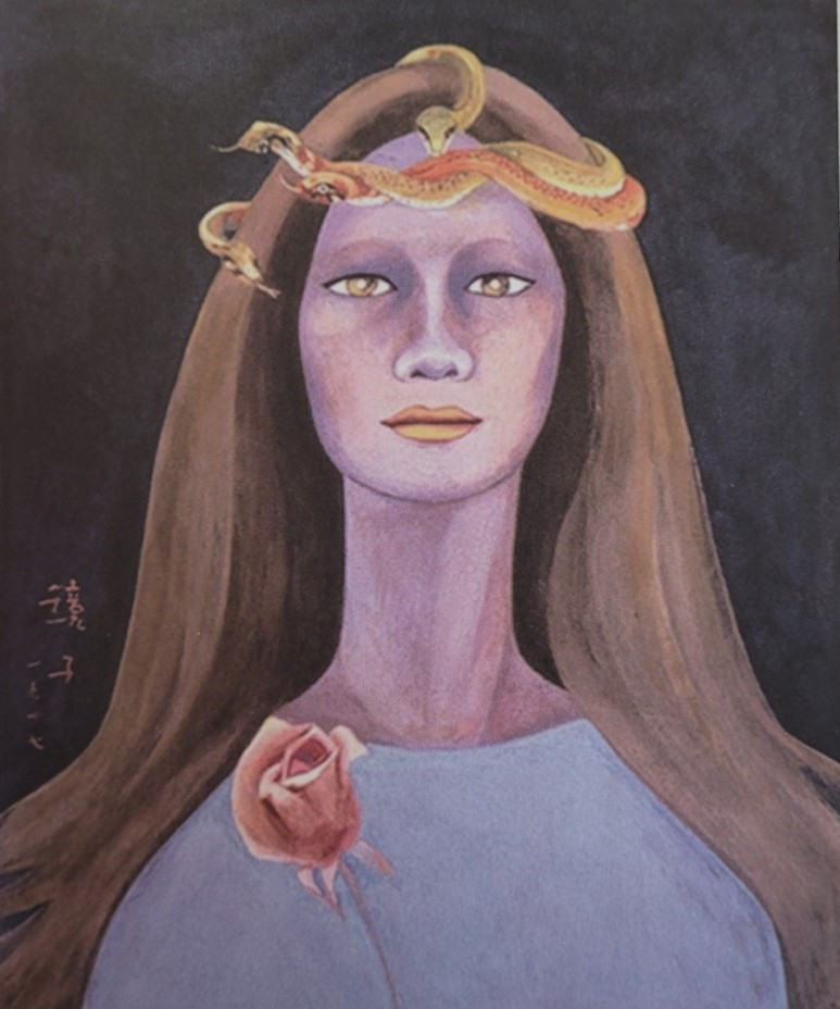 뱀을 머리에 화환처럼 두르고 가슴엔 장미꽃을 꽂은 긴 머리 여인이 정면을 응시하고 있다. 22살 때의 결혼과 첫딸을 낳았던 경험, 슬프고 우울한 기억을 자신의 자화상에 형상화한 작품이라 한다. 자화상 속의 형형한 눈빛은 세상을 달관한 자의 눈빛이다. 그녀 자신을 그리면서 수없이 응시했을 그녀의 '눈'. 눈동자 속에는 지상에서 '천경자'라 불리는 여인이 앉아 있다.