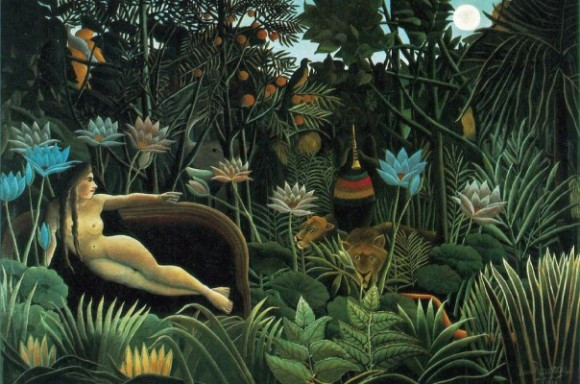 앙리 루소의 마지막 작품으로 알려진 '꿈'은 야드비가의 꿈을 그린 작품인데 소파에서 잠든 야드비가가 정글로 옮겨진 꿈을 꾼 것을 형상화했다. 문명의 상징인 소파 위에 벌거벗은 야드비가가 누워있다. 초록 잎 사이사이로 동물들의 모습이 보인다. 정글은 화가 루소의 상상력이 빚어낸 공간이다. 세밀화를 보는 것처럼 섬세하고 정교한 묘사는 세상 어딘가에 인간의 손 때 묻지 않은 이런 정글이 존재할 것 같은 생각이 들게 한다.