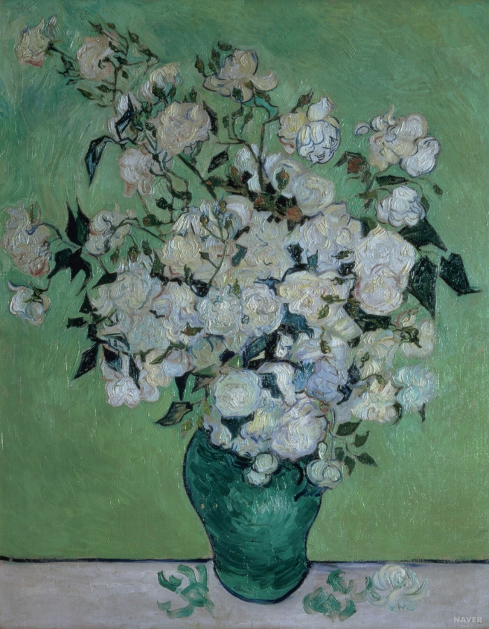빛바랜 캔버스 속... 백장미처럼 보이는 그의 분홍 장미들... 강렬한 붓꽃들.. 삶에 대한 열망이 꿈틀거리는 그의 작품 속 어딘가에 가난하지만, 가난하기에, 가난함에도 불구하고 끝없이 무언가를 그려야먄 했던 고흐의 몸부림이 남아있다. 그는 세상에 없지만 그의 몸부림은 오늘을 살아가는 우리에게 끝없는 자극이 되어준다. 최악의 순간이 오더라도 자신이 늘 하던 것에서 손을 떼지 말아야한다는 그의 가르침이 들려온다. 다만 늘 하던 것을 유지하기 위해서 그는 얼마나 더 많은 피를 캔버스 위에 흘려야 했을까. 결국 그의 작품은 피로 쓴 시가 아닐까. / 끝