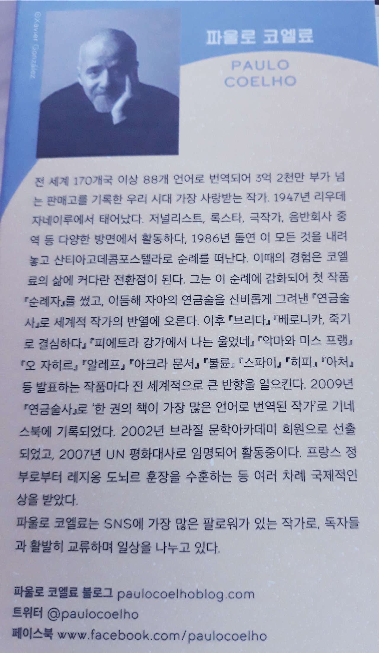 코엘료는 작가의 말에서 이 말을 진심으로 믿고 있다고 강조하며 자신이 겪은 일화를 소개한다.