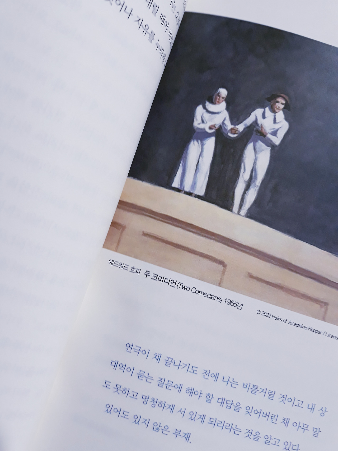 젊은 광대와 젊은 코미디언은 그 과장된 연기를 감쪽같이 해낸다. 관객이 그의 눈에 비친 이슬 한 조각을, 그의 입꼬리에 걸친 냉소 한 조각을 알아차릴 새도 없이... 완벽하게, 능수능란하게...