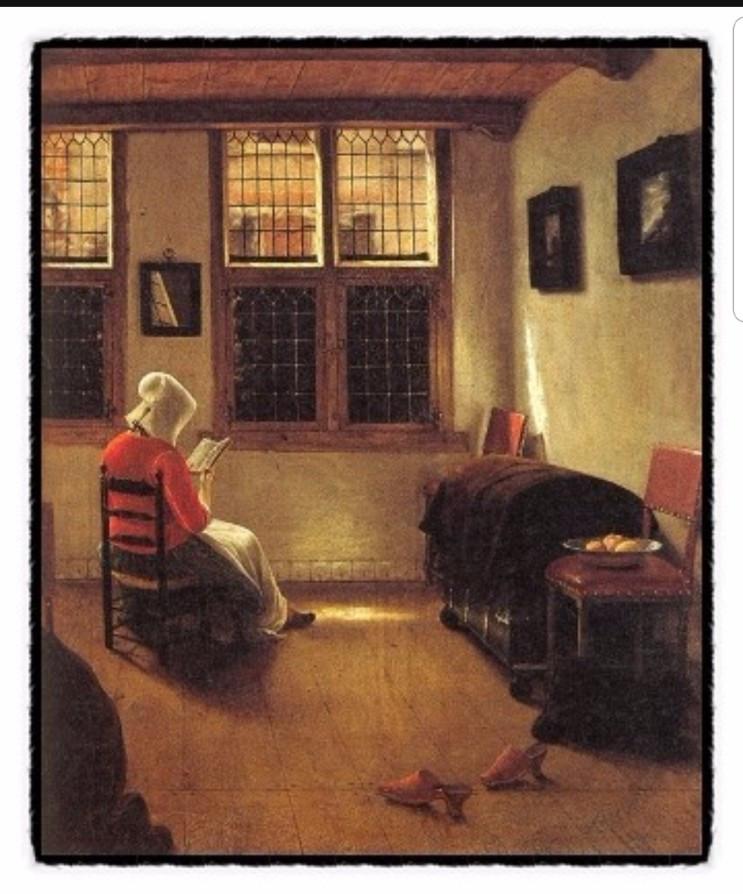 아마도 내가 책을 좋아하고 책을 미치도록 사랑하게 된 것은 유년시절 내내 마주한 이 그림의 영향 탓이라 해도 과언이 아닐 것이다. 아버지가 내게 물려운 문화적 유전자 밈 (meme)은 이미 어린 시절 이 그림을 통해 구체화되었는지도 모른다. 그러나 한 편 이 그림이 불편해지는 것은 인형처럼 차려입은 그녀가 책을 통한 지성의 고양을 위한 것이라기보다는 그녀의 지적 허영에 어울리는 더 높은 배우자를 얻기 위한 수단이나 방편처럼 보여서다. 현숙한 아내가 되기 위한 지적인 조건의 필요충분조건 같은 것 말이다. 이 작품은 분명 유년기의 내게 책에 대한 환상을 심어주기에 충분한 작품이지만 그림 속 여인은 마네킹처럼 굳어있다. 인식의 꿈틀거림이 보이지 않는다. 물론 내 눈의 착시일 수도 있지만.... 그녀 내면의 이글거림을 보지 못하는...