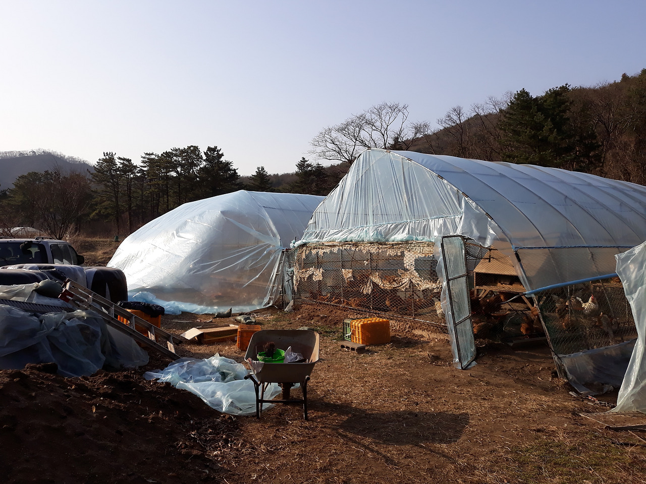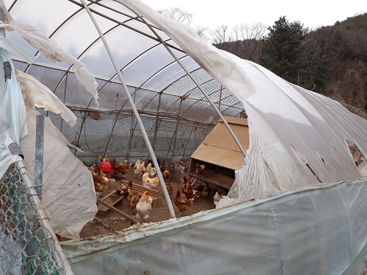 경험이 쌓이면서 일이 꽤나 능숙해졌을 쯔음, '이제는 내가 좀 쓸모가 있는 걸까...?라고 생각하던 무렵의 어느 날, 갑자기 바람이 엄청나게 불어왔고 양계장의 비닐하우스가 찢어져 버렸다. 찢어진 비닐 사이로 보이는 닭들의 모습은 괜히 띨빵해 보이기도 하고 귀여웠지만 이는 닭의 체온 관리, 건강 관리를 고려했을 때 빨리 해결해야 하는 문제였다. 얼른 비닐을 갈아주어야 했다.