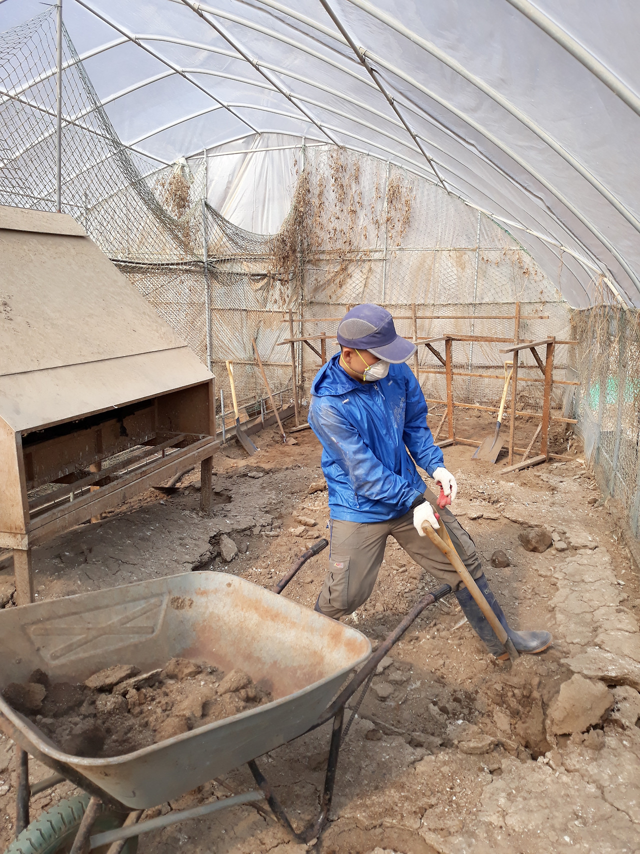 빽빽이 굳어 있는 혼합물을 곡괭이로 적당히 깨고, 삽으로 퍼내고, 손수레에 가득 찰 때까지 싣고, 정해둔 장소까지 가서 쌓아 둔다. 대략 20평 정도 되는 닭장 20칸에 걸쳐 이 작업을 계속했다.