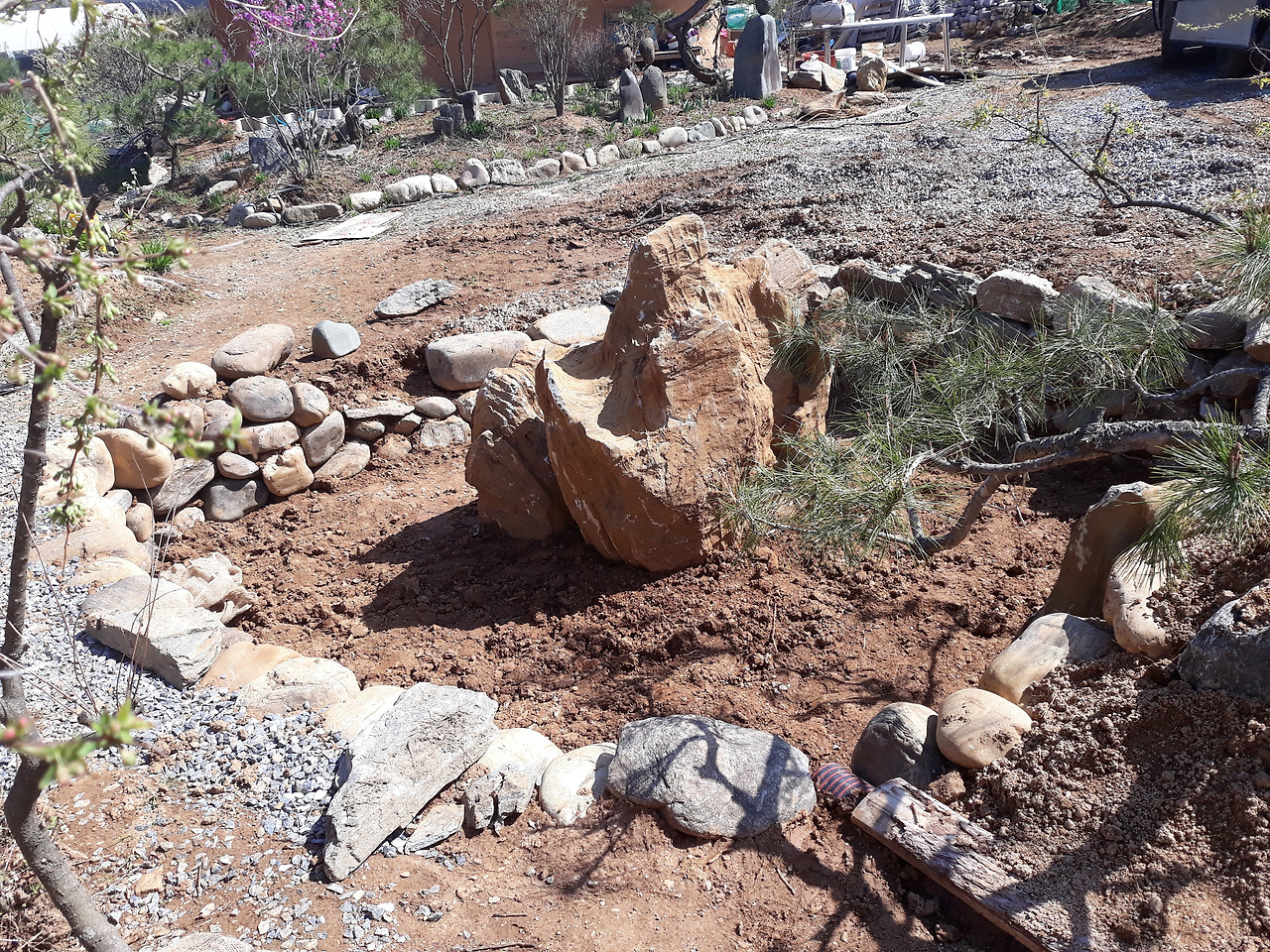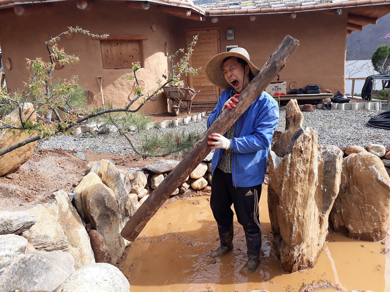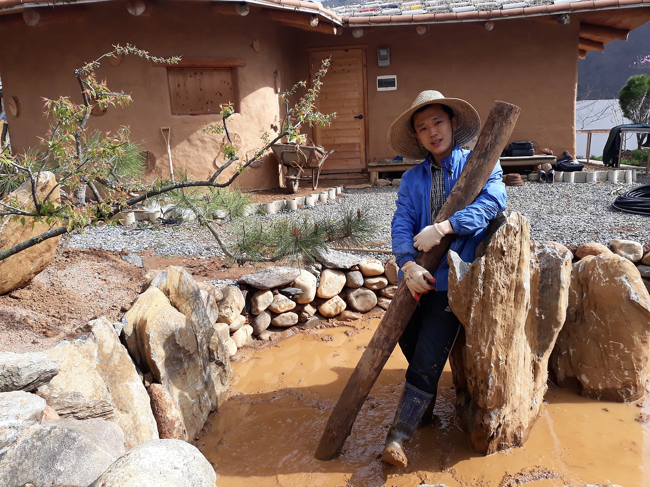 나로서는 다행이게도, 지내는 동안 소나무 관련된 일만 한 것은 아니었다. 호스트님은 반 농담으로 시기를 잘못 골라서 왔다고, 갑자기 주문이 많이 들어와서 이례적으로 소나무 일이 많았던 것이라고 말씀해주셨다. 소나무 작업이 어느 정도 마무리된 이후로는 공터에 연못 및 정원을 만드는 일을 했는데, 이게 참 재미있었다.