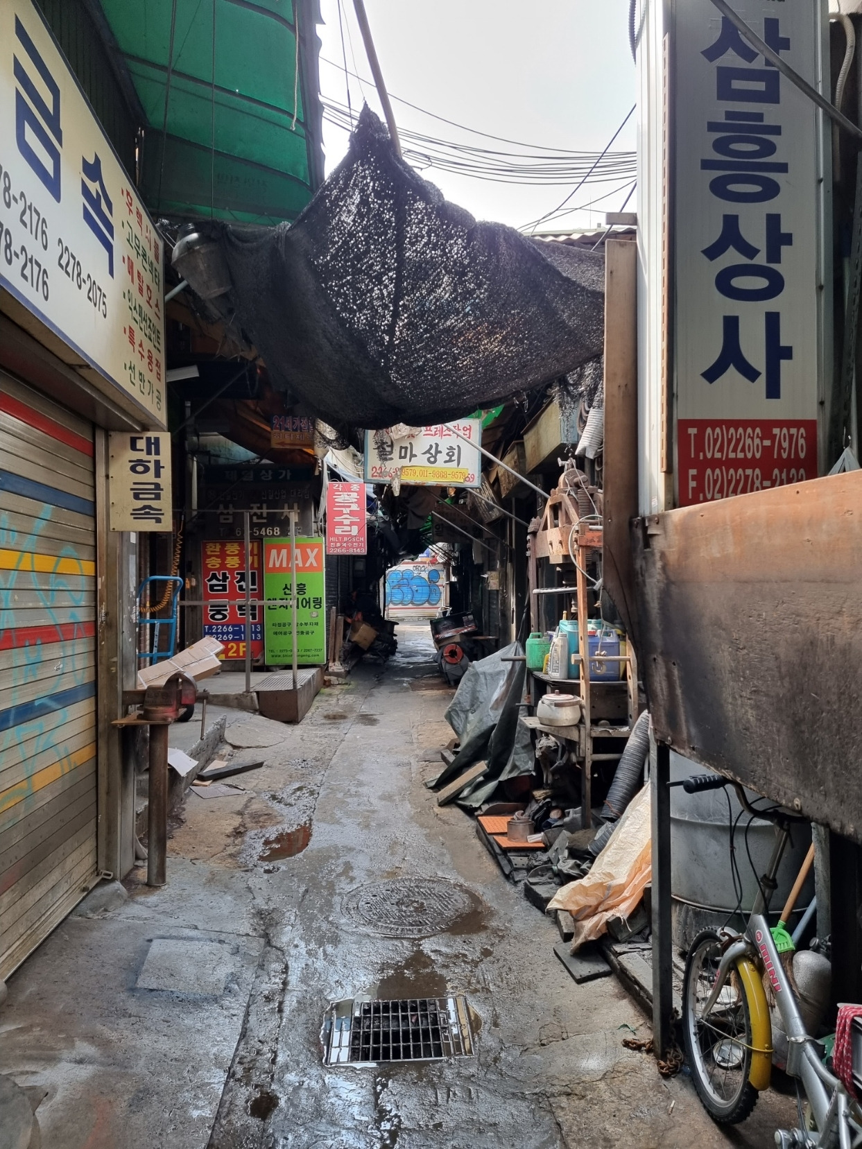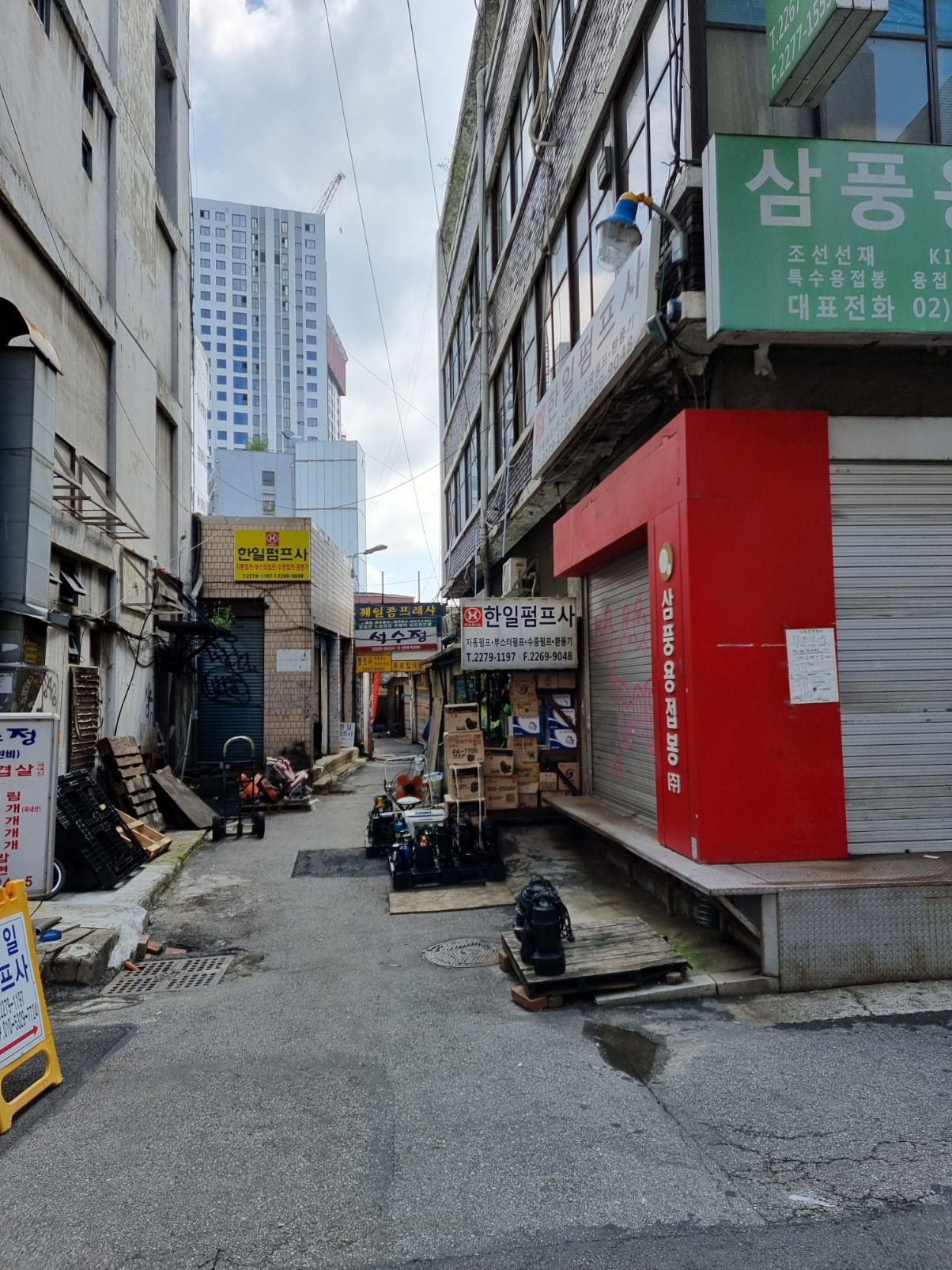 을지로 공구상가의 허름한 골목, 재개발로 올라가는 건물들과 대조를 이룬다