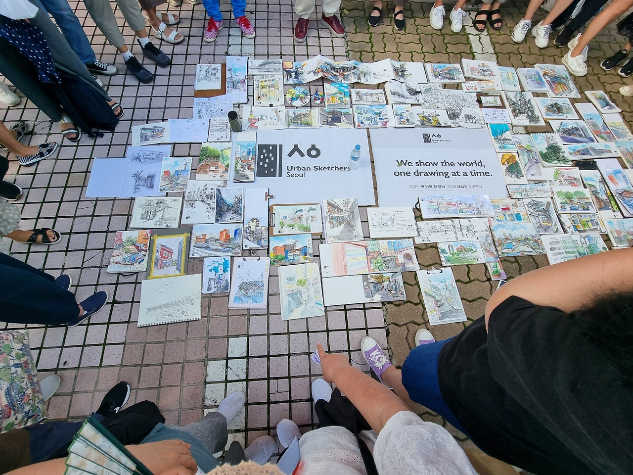 어반 스케쳐스_서울의 깃발 아래 그림들이 모여든다. 크고 작고, 길쭉하고 네모나고, 족자처럼 펴지고, 누구는 화려하게 채색하고 누구는 단색으로 하는 등 각양각색의 그림들이 서로 어울리니 이 또 한 장관이다. 동료들의 그림을 보면서 감탄하며 반성하고, 격려하며 위로받고, 또 필요한 정보를 얻고....... 잠시 술렁이는 시골장터 같은 분위기를 정리하고, 기념사진을 끝으로 오늘의 모임은 막을 내렸다.
