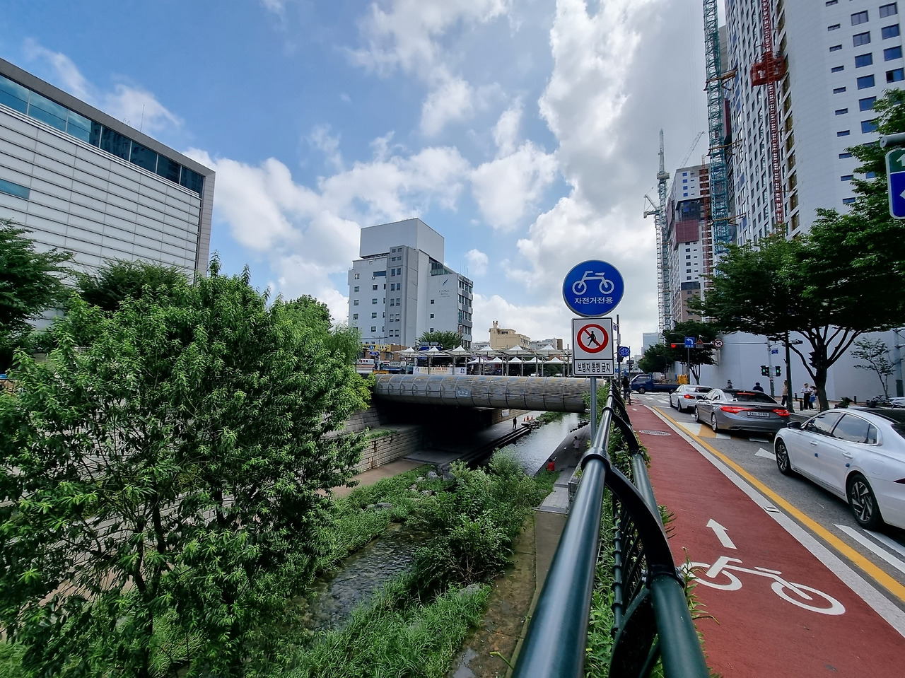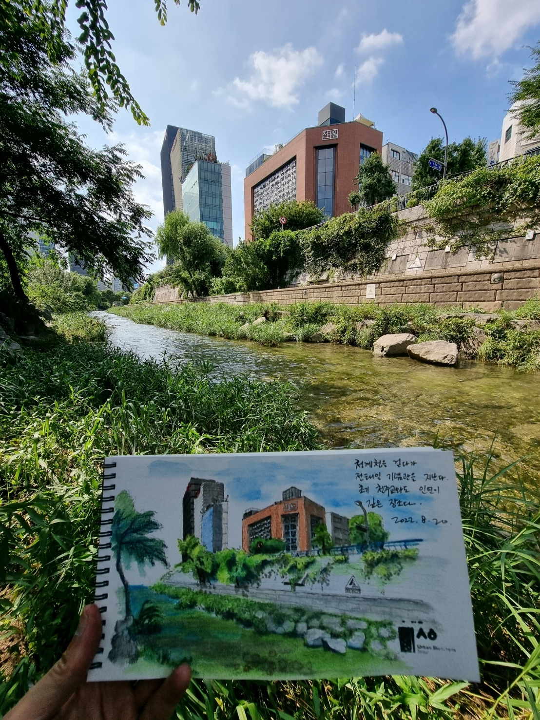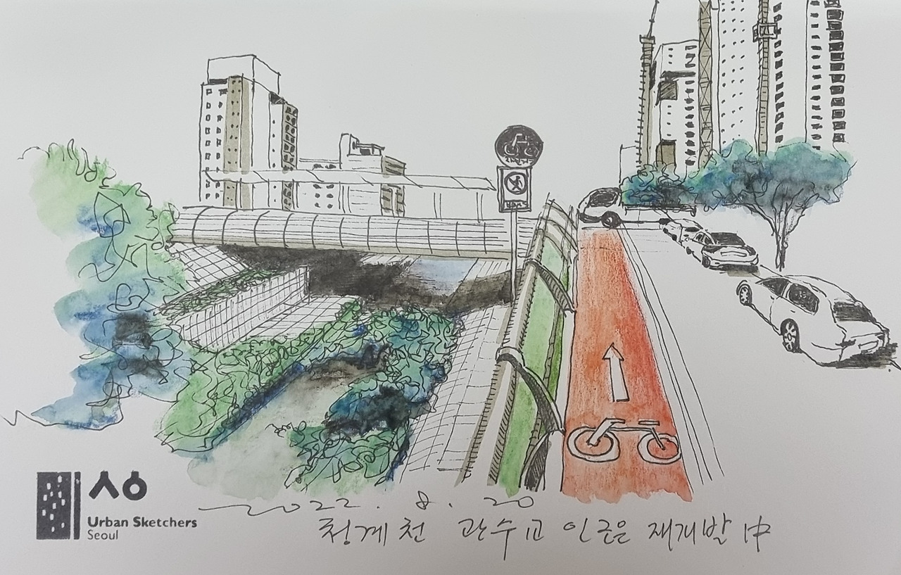 오전 10시 30분, 계양 공구 앞의 꽤나 넓은 공간에 운영 본부가 차려지고 나는 그곳에서 명찰을 구입했다. 오늘 참여하는 어반이들이 워낙 많아 골목에서 마주치면 알아보기 쉽도록 패용하는 것이다. 조우하면 살짝 눈인사를 하거나, 이야기를 나누는 등 그림쟁이라는 동질감을 주는 데 그만이다. 잠시 후 어반 스케쳐로 함께 첫 발을 디딘 동지들을 만나 오늘의 스케줄을 공유하고 각자 적당한 장소를 찾아 흩어졌다. 강렬한 직사광선이 내리꽂는 터라 야외에서 어반 스케치를 하기에는 너무 무더운 날씨였다. 나는 공구상가의 뒷골목과 청계천변을 한참 돌아다니다가 물가에 자리를 잡기로 하였다. 물이 흐르는 천변의 나무 그늘은 생각만 해도 최적이었다.