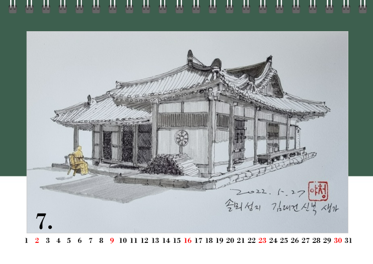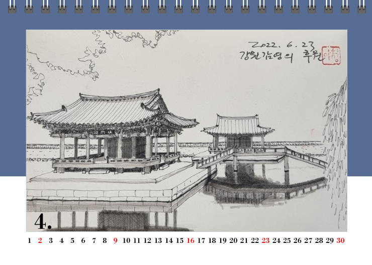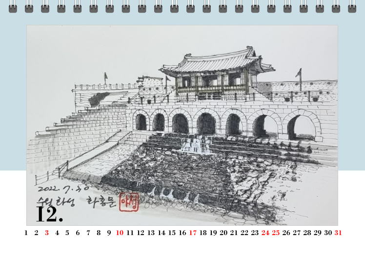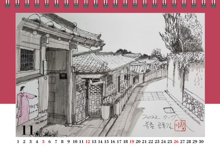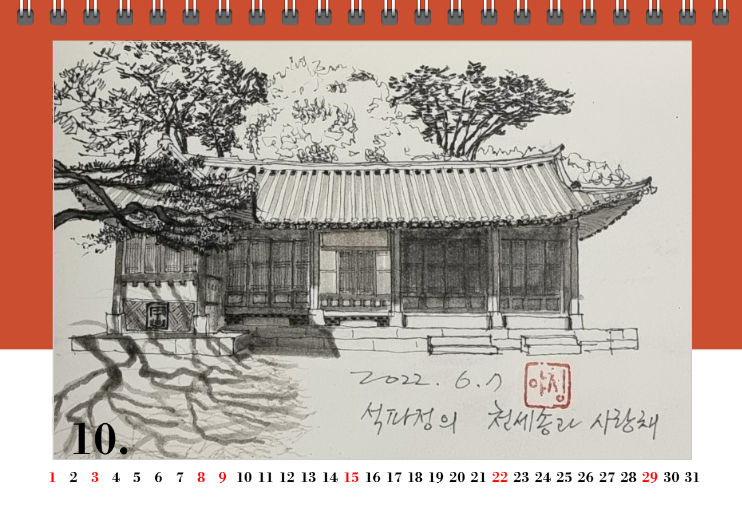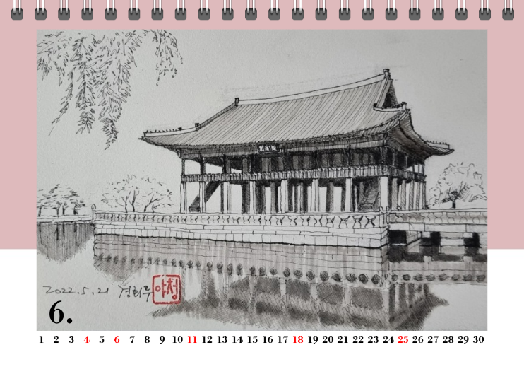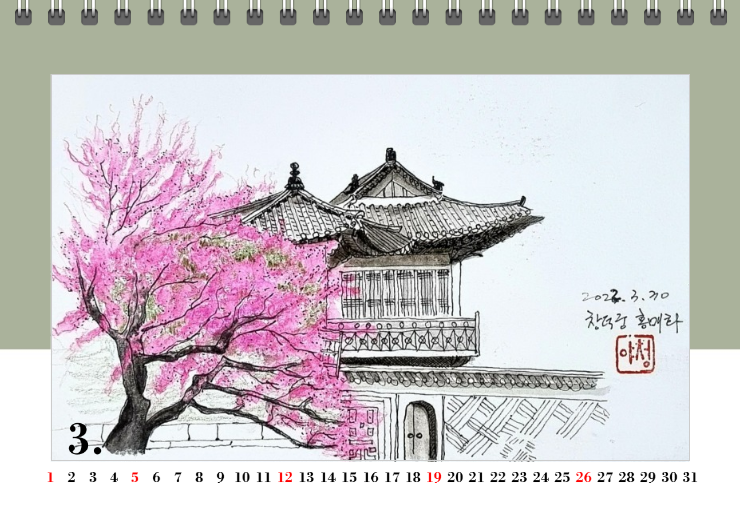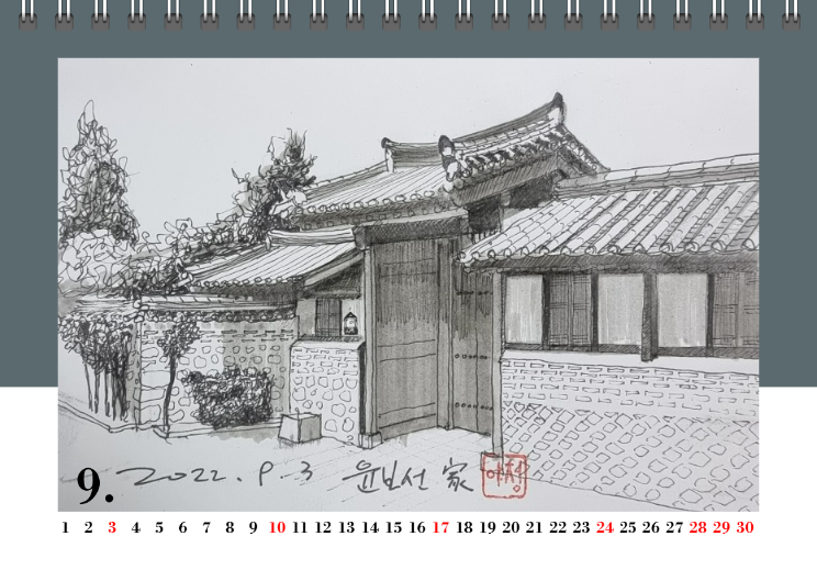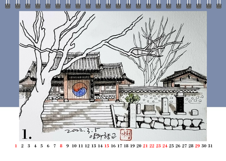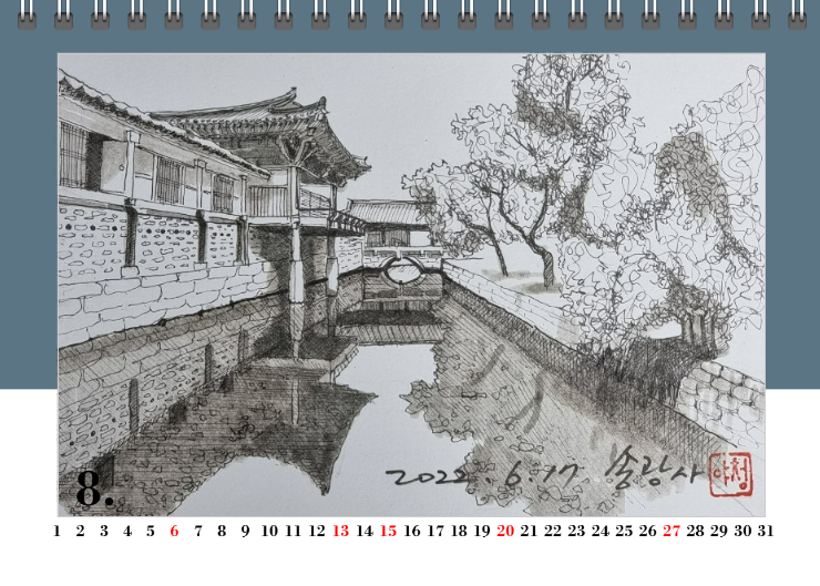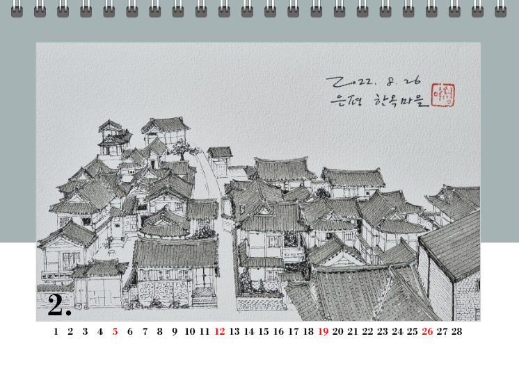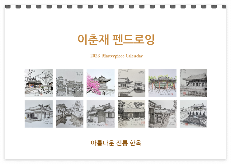 여운이 채 가시기 전에 나는 새로운 시도를 하였다. 바로 펜 드로잉 달력을 만드는 일이었다. 이번엔 주저하거나 머뭇거리지 않았다. 실행을 하는 데 거칠게 없었다. 올해 초 입문한 펜 드로잉 작품들이 꽤나 쌓여서 아마도 이런 생각을 하게 된 것인지도 모른다. 이번에 달력을 만들면 연말 친구들 선물로 제격이란 생각이 들었다. 많은 작품들 중 12개를 고르고 온라인 인쇄소를 검색해 주문을 했다. 전광석화 같은 실행력으로 후다닥 해치우고 달력을 기다리는 동안 어찌나 설레었던지 모른다.