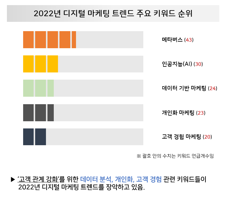 또한 2022년 디지털 마케팅 트렌드 키워드를 살펴보면, 고객 관계 강화를 위한 데이터 분석, 개인화, 고객 경험 관련 키워드들이 증가했다는 것을 알 수 있는데요. 1순위 핵심 키워드는 2022년 핫했던 ‘메타버스’가 차지했고, 그 다음으로 인공지능(AI), 데이터 기반 마케팅, 개인화 마케팅, 고객 경험 마케팅 순으로 높게 나타났습니다.