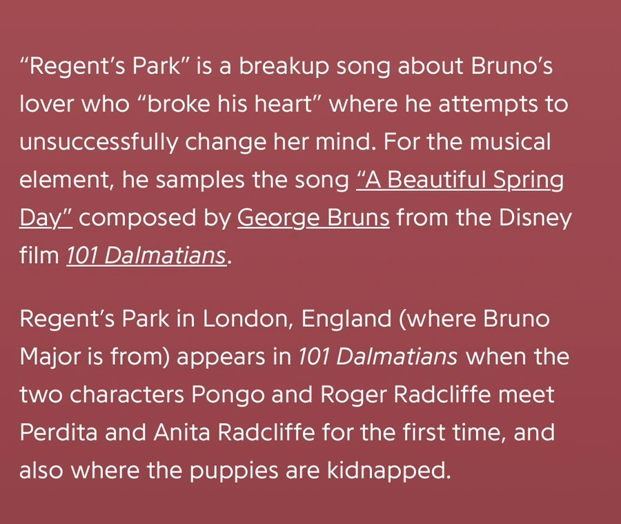 무계획 중의 무계획으로 떠나온 이번 휴가에서 유일한 계획은 햇살 가득한 리젠트 파크에서 Bruno Major의 Regent’s Park를 들으며 하염없는 시간을 보내는 거였다. 어릴 적 비디오테이프가 늘어질 만큼 보고 또 보던 <101마리 달마시안>에서 퐁고와 퍼디가 처음 만났던 거기. 로저와 아니타가 호수에 빠졌던 바로 거기. 그곳에 내가 있다. <101마리 달마시안>의 도입부에 로저가 작곡하던 곡을 샘플로 해서 Bruno Major가 Regent’s Park라는 곡을 만들었는데, 그 노래를 들으며 애정하는 영화를 상기하는 순간이 아주 황홀하다. 어쩌면 십 년 전 영국을 왔던 건, 그리고 지금 다시 런던에 오고 싶었던 건, 유년 시절의 추억을 곱씹는 마음일지도 모르겠다.