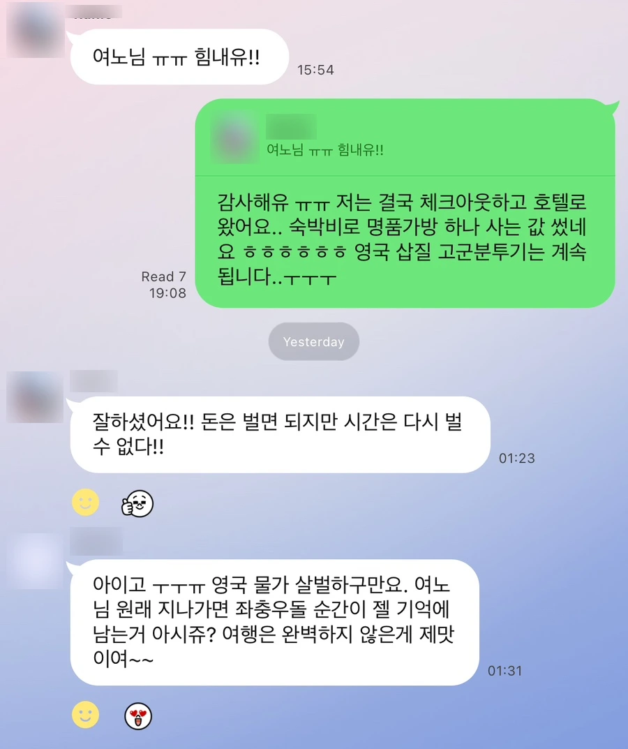 영국에서의 매일을 SNS로 가감 없이 나누면서 좋은 점은 혼자여도 함께 있다는 것. 흔들리는 나에게 든든한 심지가 되어주는 친구들 덕에 선덕거리는 마음을 쓸어내린다. 괜찮아! 유럽 와서 명품 가방 하나 샀다고 생각하면 되지 뭐! 그런데 실체는 없는 어떤 그런 투명한 가방.. 벌거벗은 임금님 가방.. 촤하하하하