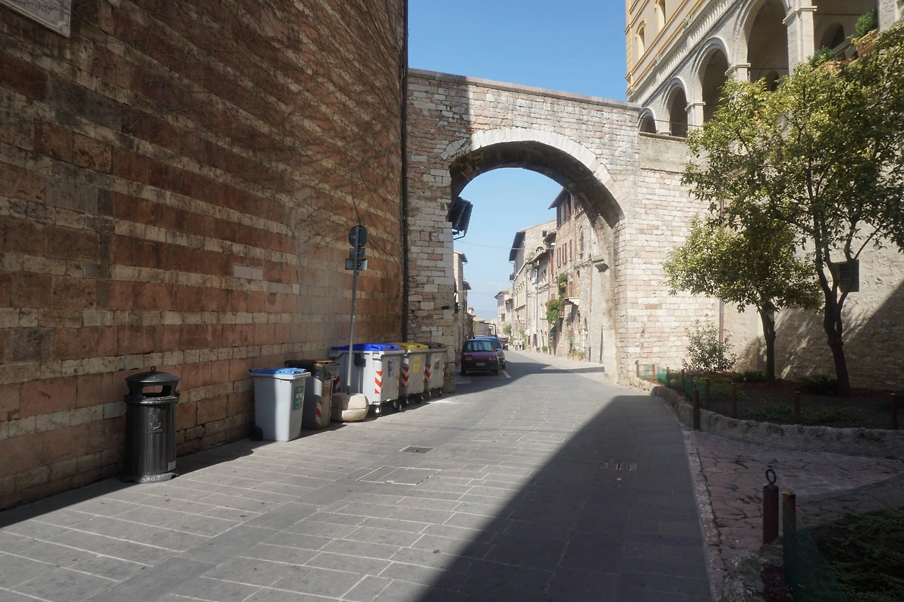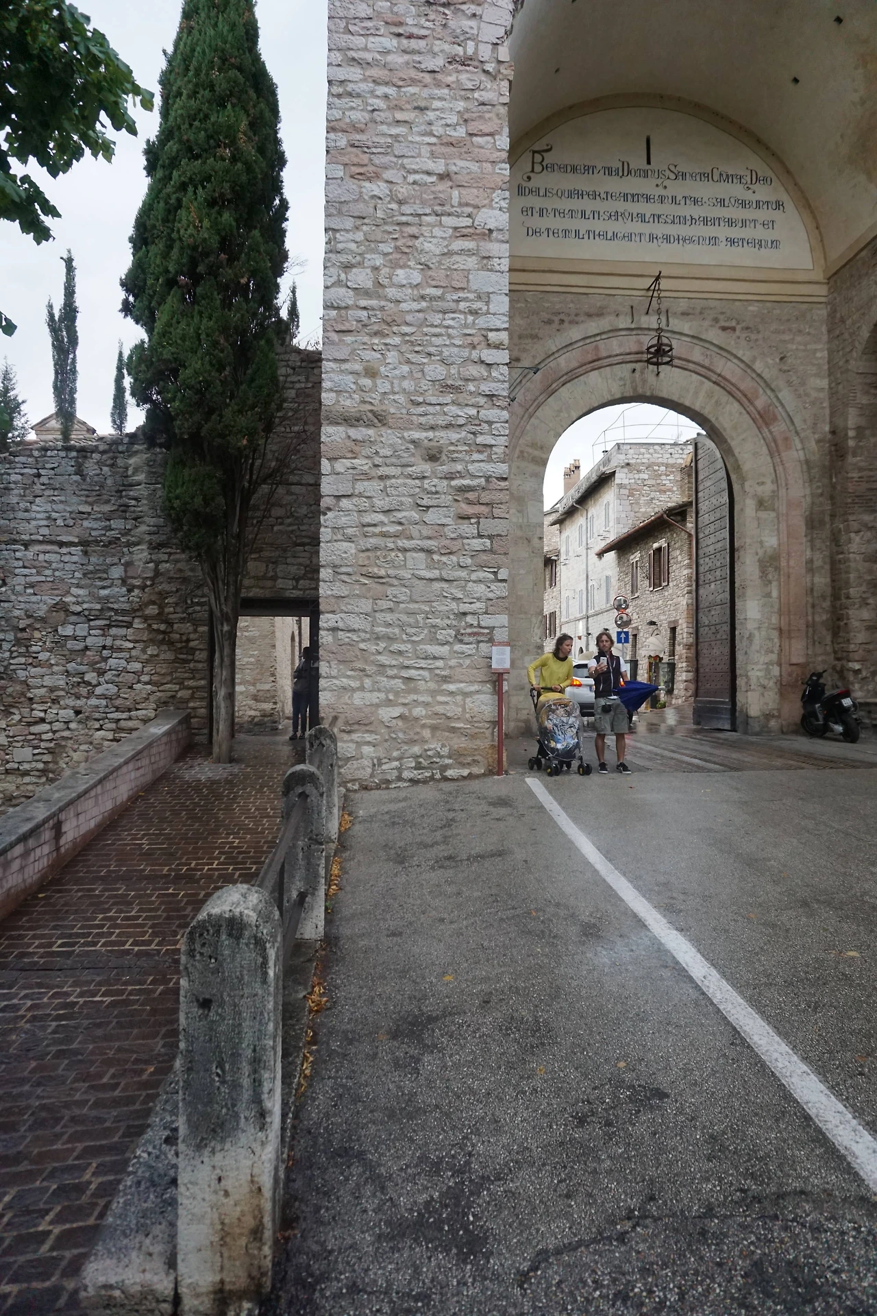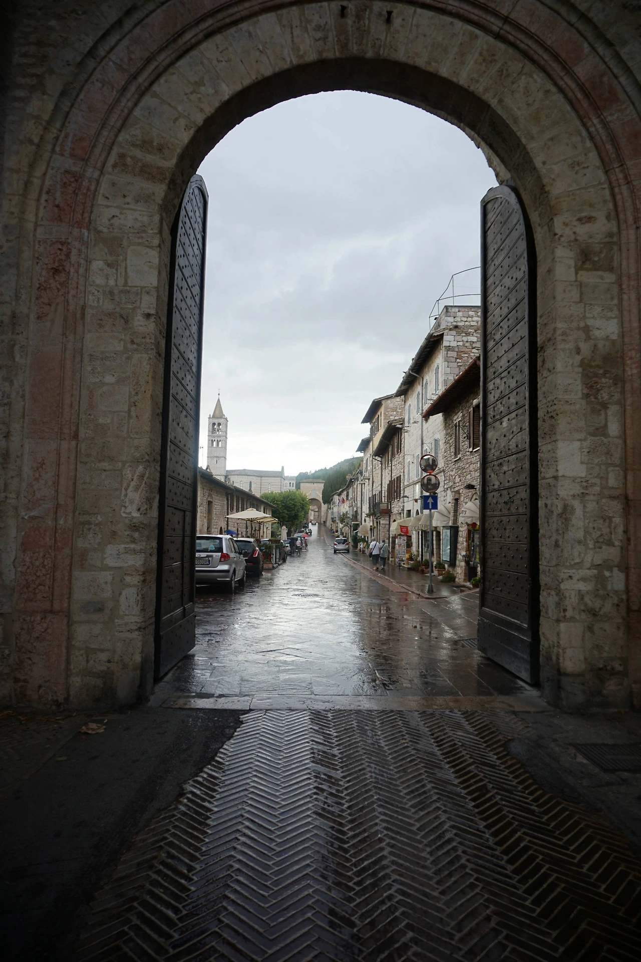 도시국가 아시시로 들어가는 문인 포르타 누오바(Porta Nouva)는 서울의 동대문 같은 곳이다. 마차가 통과할 수 있는 큰 문과 바로 옆에 사람이 드나들 수 있는 작은 문이 함께 있다. 지금은 닫힐 일이 없지만, 중세의 아시시는 주변 움브리아 평원의 모든 생산품이 모이는 장소였던 만큼 이 문을 통과할 수 있다는 것 자체가 큰 특권이 아니었을까 하는 생각을 해본다. 문을 지나 곧게 뻗은 길과 길의 끝에 보이는 산타 키아라 대성당, 비 온 뒤 밝아지는 하늘빛이 묘한 대조를 이루고 있다.