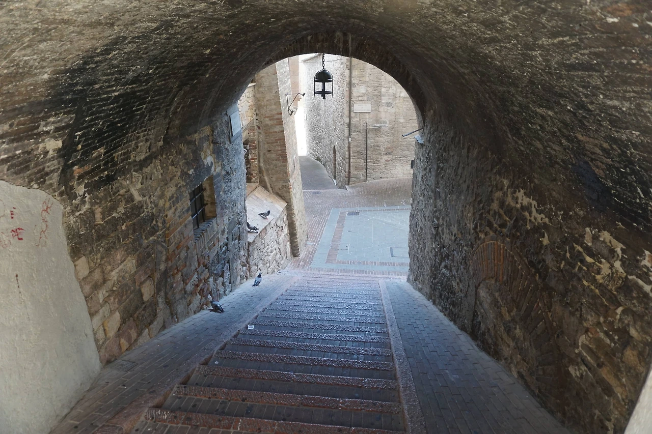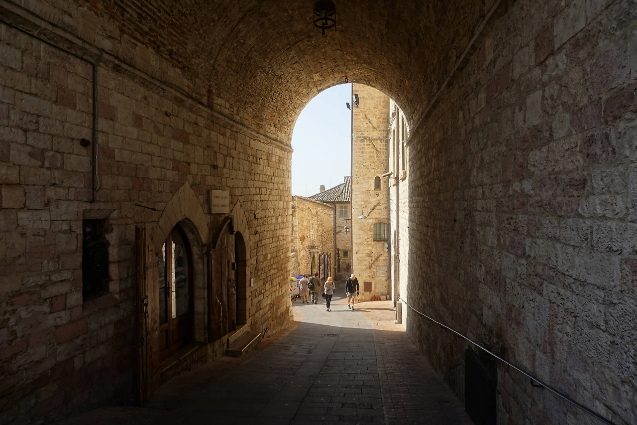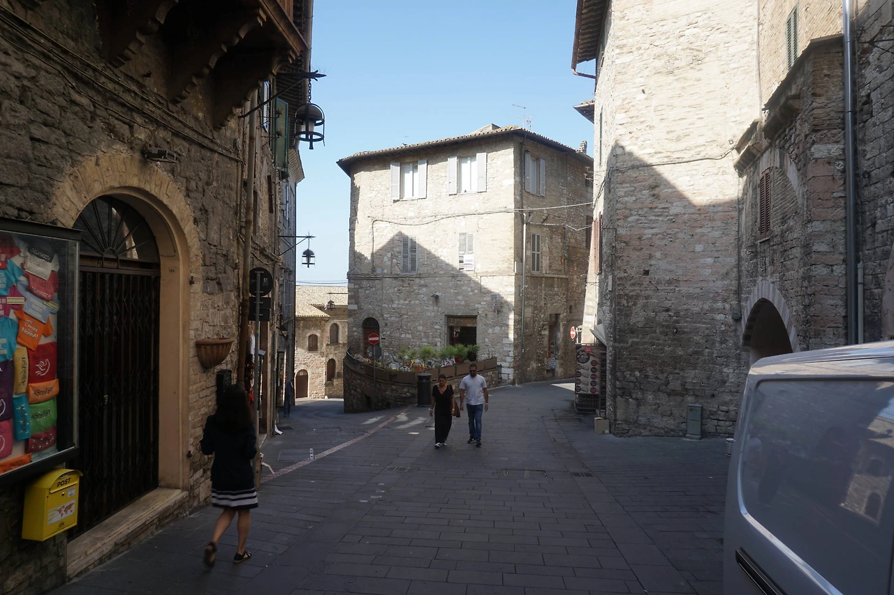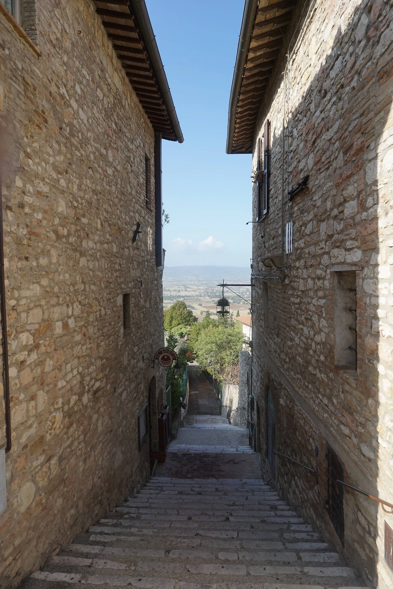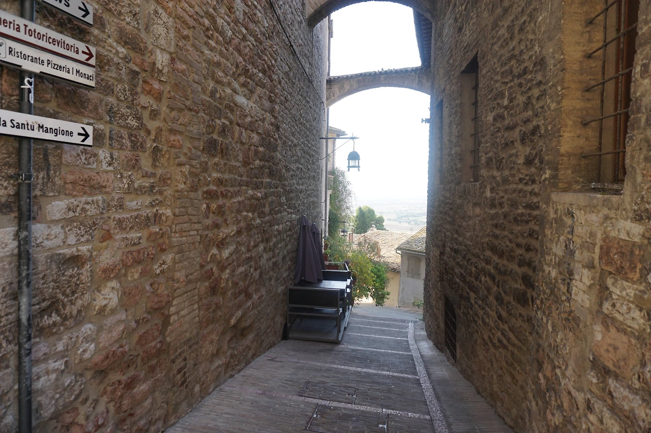 건물로 둘러싸인 길을 걸으며 답답할 즈음 한 번씩 보이는 움브리아 평원의 시원한 풍경은 무더운 여름의 단비 같은 존재다.