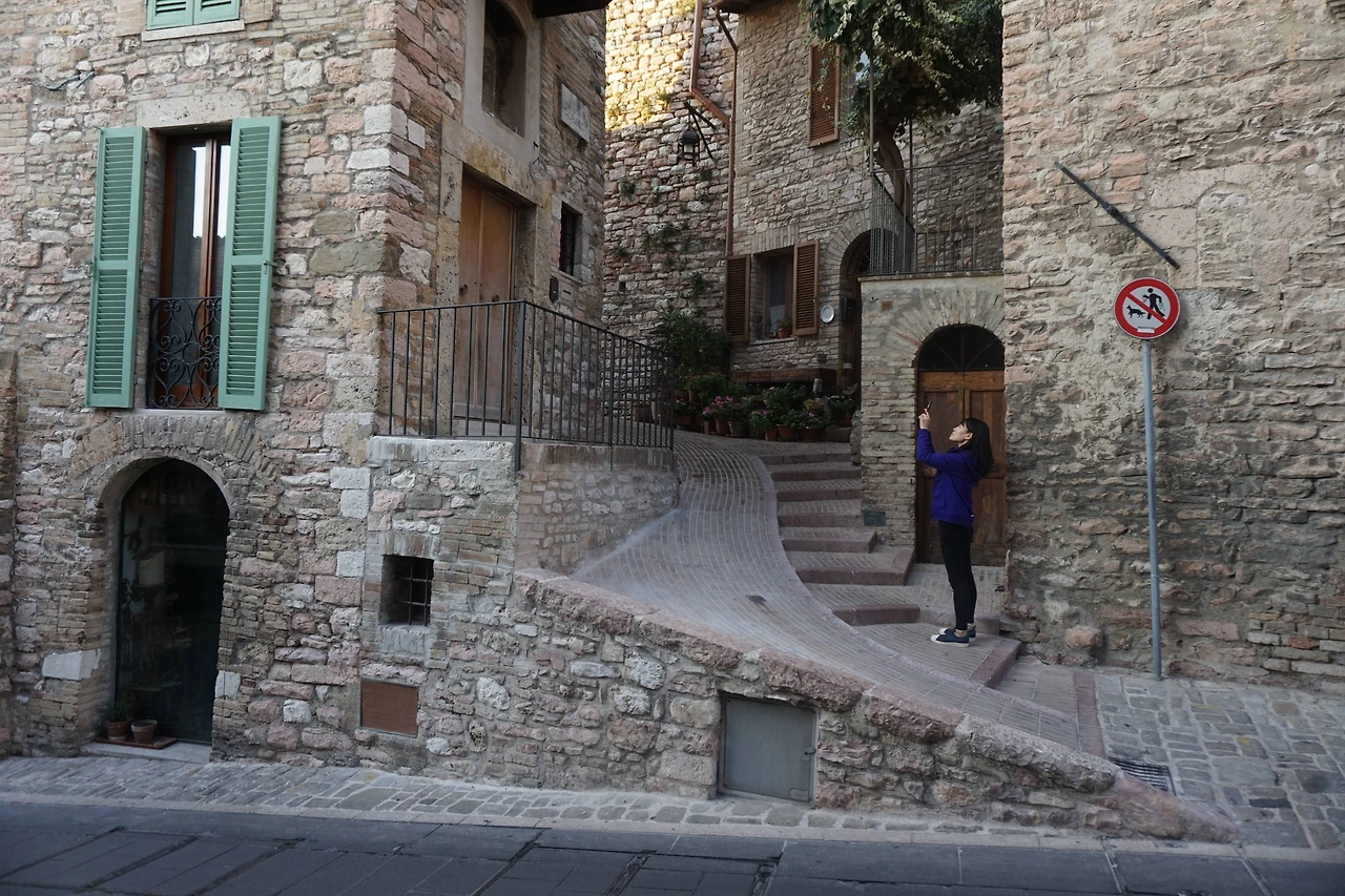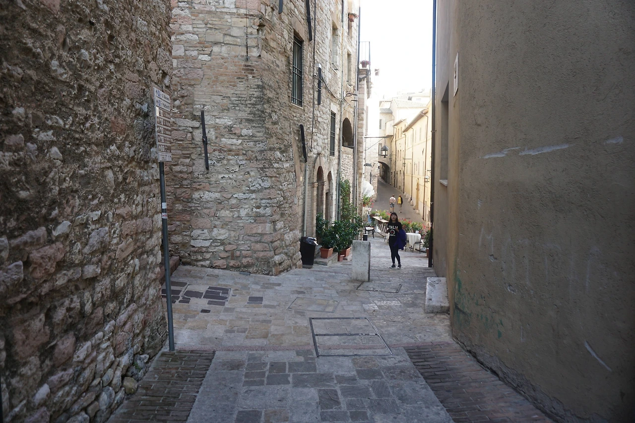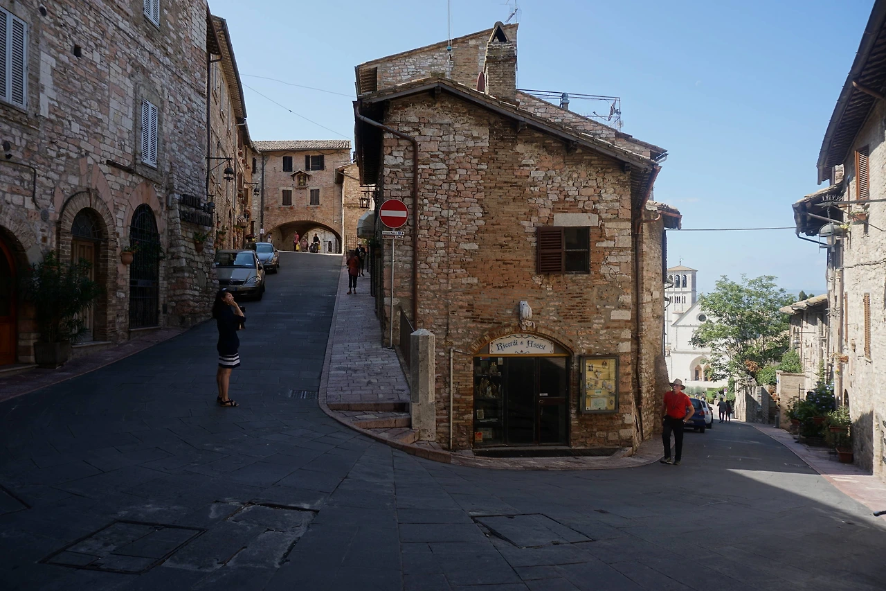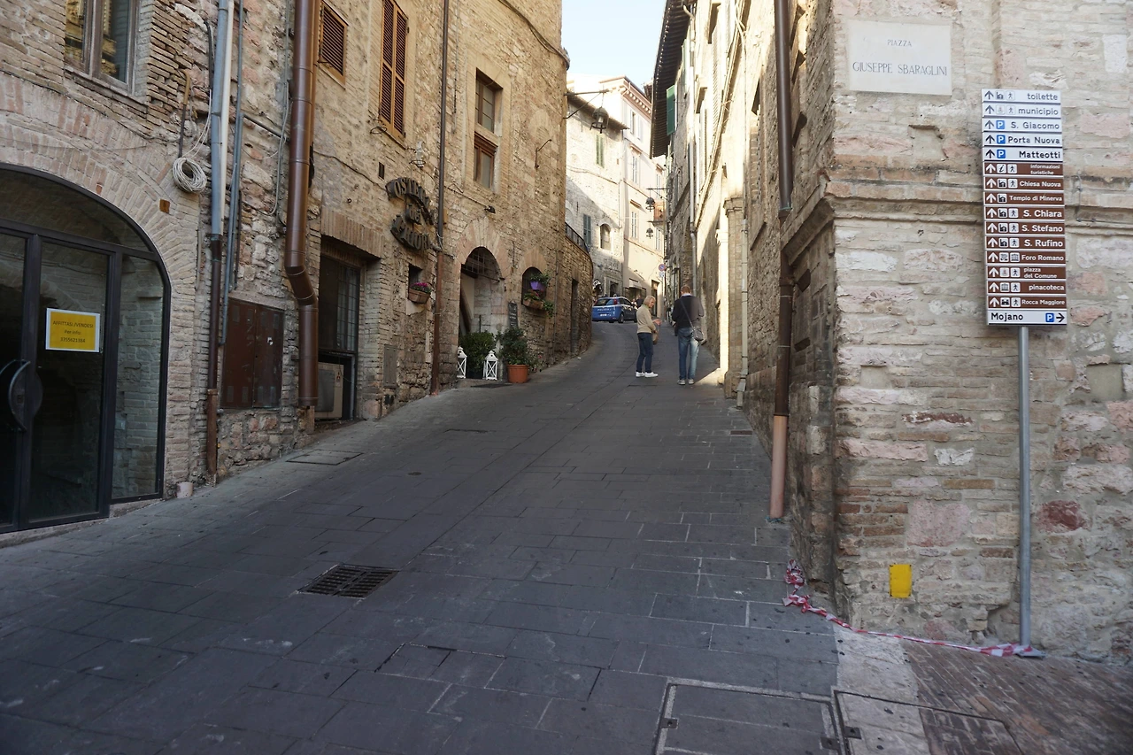 오르막의 경사는 차가 다닐 수 있는 정도다. 이 정도의 도로는 아시시에서도 꽤 넓은 편에 속한다. 성 프란치스코 성당에서 성문으로 이어진 길이어서 마차가 다닐 수 있어야 했기 때문이리라.