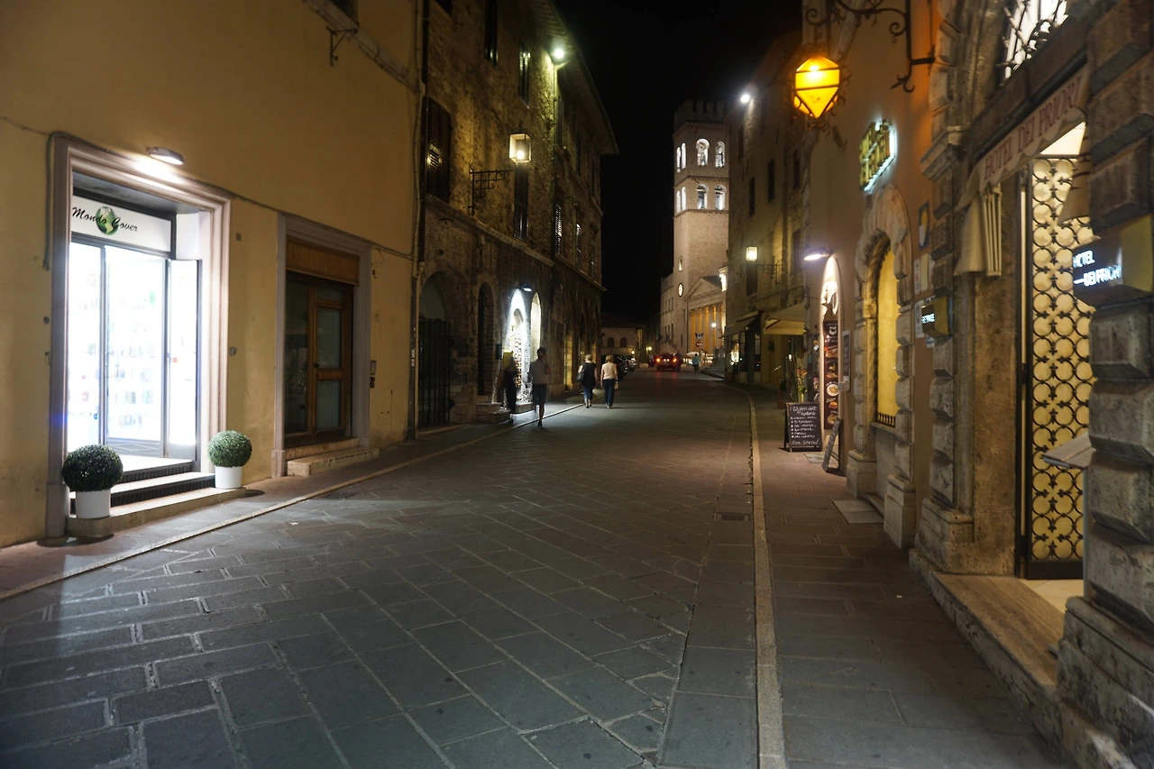 코무네 광장으로 가는 길의 밤은 상가에서 켜놓은 조명으로 낮과는 다른 분위기를 풍긴다. 너무 과하지도 모자라지도 않은 조명들과 산타 마리아 미네르바 소프라 성당이 아시시의 밤거리를 지키고 있다.