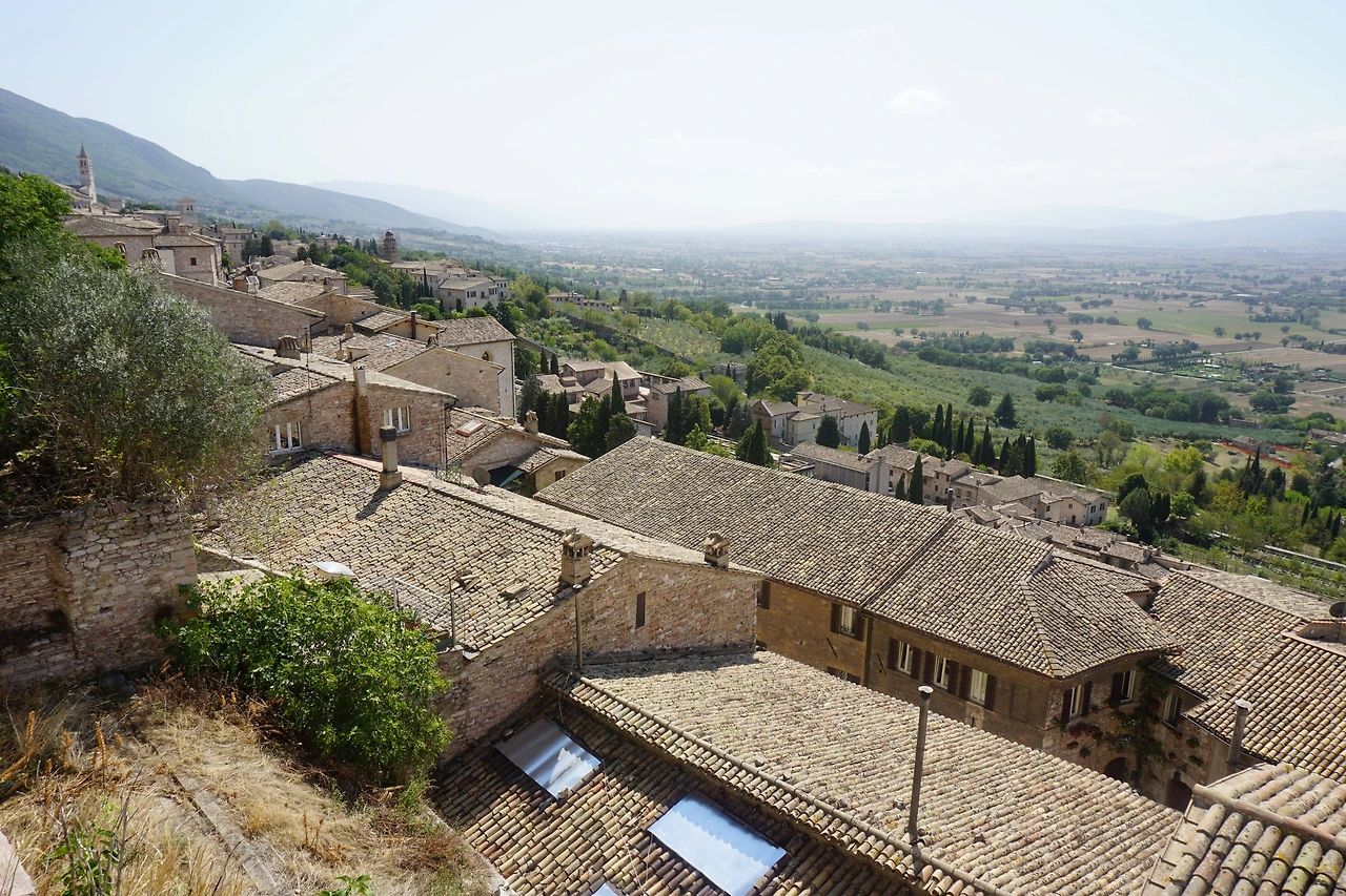 아시시의 가장 높이 있는 골목을 걷다 보면 저 너머 시원한 움브리아 평원이 보이는 곳이 있다. 회색빛 벽돌로 둘러싸여 삭막함이 느껴질 때쯤 만나는 오아시스이다. 같은 색의 벽돌과 기와 너머 보이는 푸른 평원이 아직도 눈에 선하다.