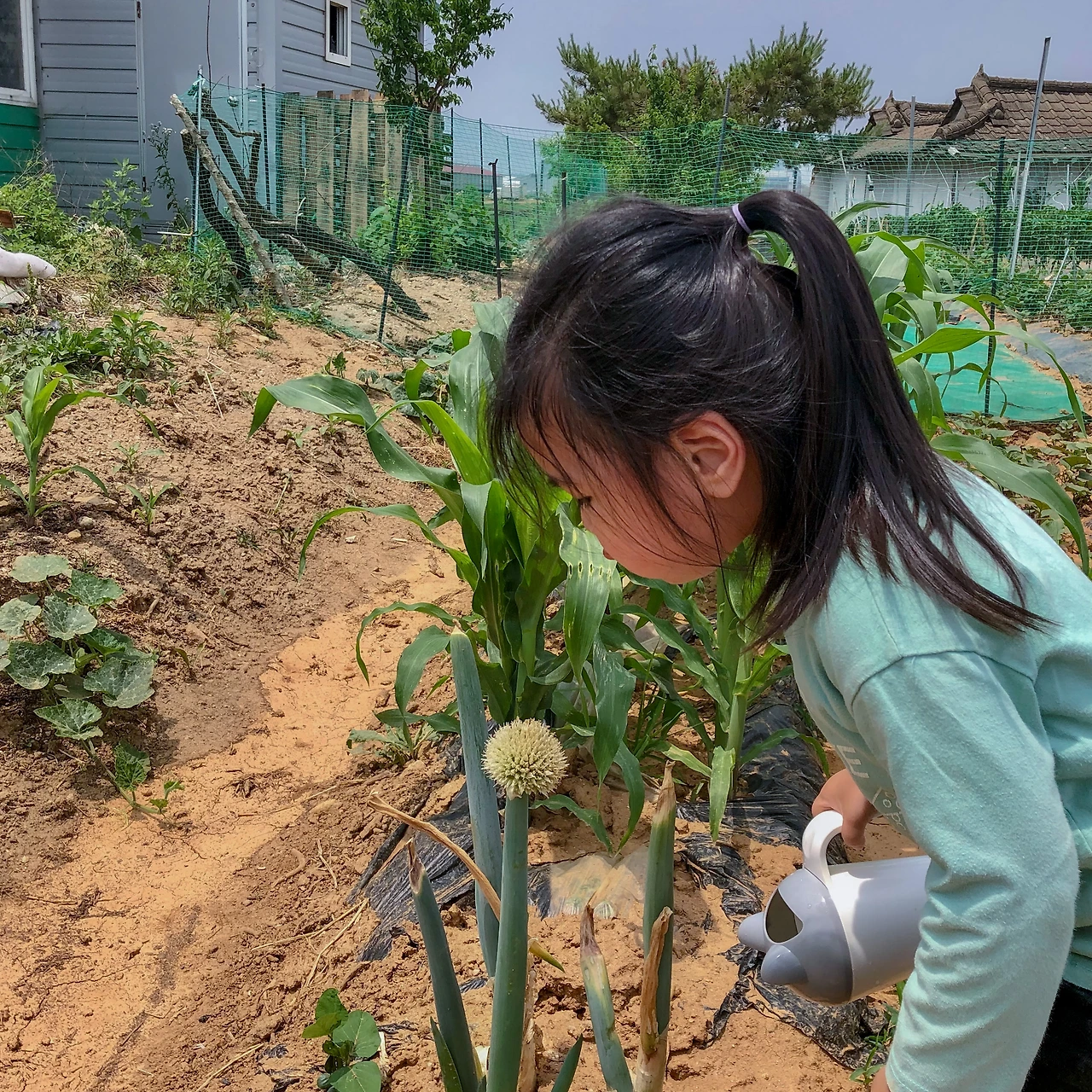 물뿌리개, 물총 등 다양한 방법으로 텃밭 작물들의 목을 축여주는 딸 아이