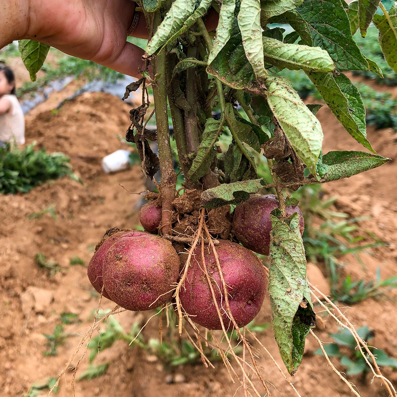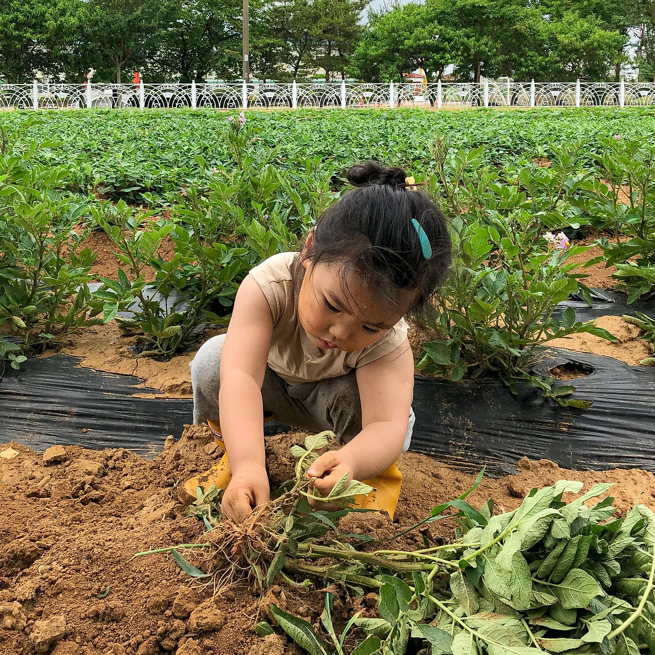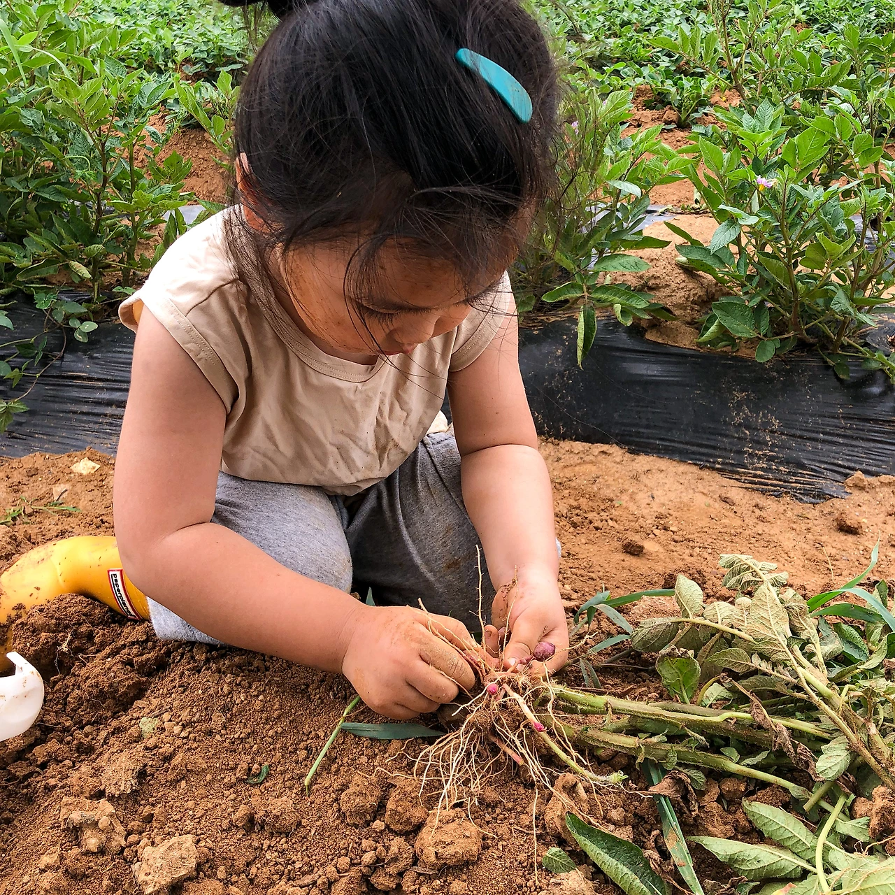 딸과의 감자 캐기 업무(?) 분담은 이랬습니다. 밭에서 감자를 감자 뿌리째 뽑아서 딸에게 주면, 딸이 감자 알맹이들을 뚝뚝 뜯어주는 것이죠. 매일 집에서 먹던 감자가 이렇게 생긴 것도 처음 보고, 실제로 캐보니 재미있는지, 딸아이는 군말 없이 열심히 감자 캐는 일을 도와주었습니다. 함께 와준 것만 해도 고마운데, 4살짜리가 일손도 거들어주다니. 딸한테 마음속 힐링을 선물해주고 싶어서 시작한 텃밭 나들이인데, 이제 보니 엄마가 힐링을 받고 있더군요.