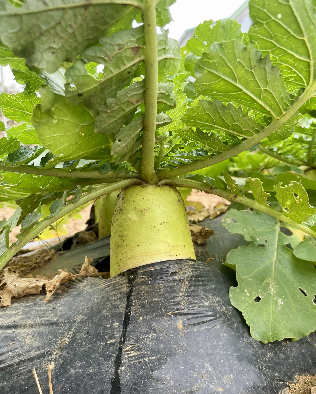 잘 자란 무는 굳어서 딱딱해져버린 땅을 가볍게 밀치고 올라와서, 이미 땅 위로도 상당한 지분을 가지고 있었습니다. 사실 그동안 무는 왜 위는 파랗고 아래는 하얀지 궁금했습니다. 이제 보니 파란 부분은 땅 위로 올라온 부분이었네요. 땅 위로 올라온 파란 부분이 무에서 유독 달달한 부분인 거 아시나요? 땅 위에서 갖은 추위와 풍파를 견디면서도 그렇게 달달할 수 있었네요.