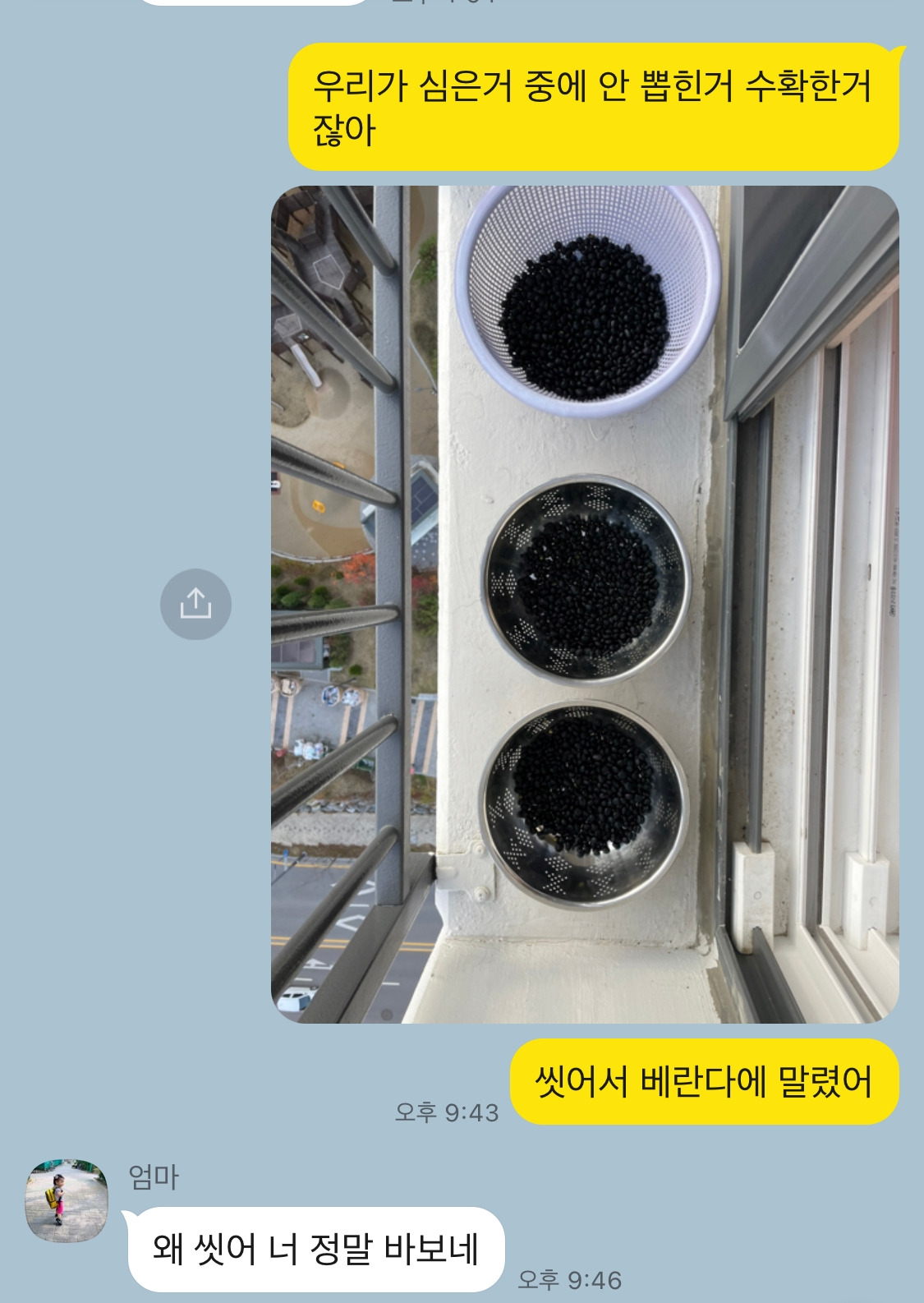 "우리 엄마가 너 콩 안 가져가냐고 물으시는데?"